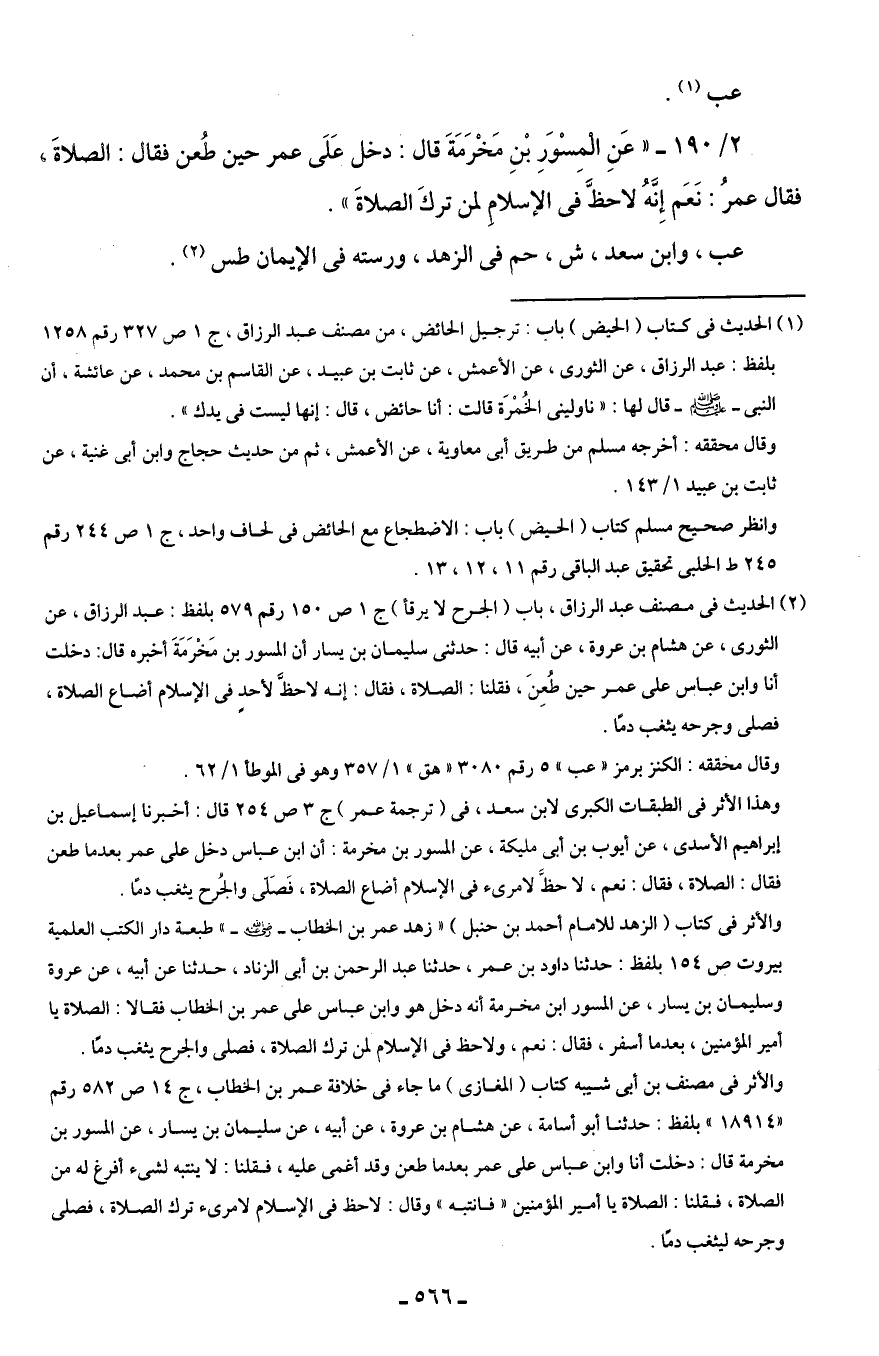 2/ 190 - "عَنِ الْمِسْوَرِ بْنِ مَخْرَمَةَ قال: دخل عَلَى عمر حين طُعن فقال: الصلاةَ، فقال عمرُ: نَعَم إِنَّهُ لا حظَّ في الإسلامِ لمن تركَ الصلاةَ".