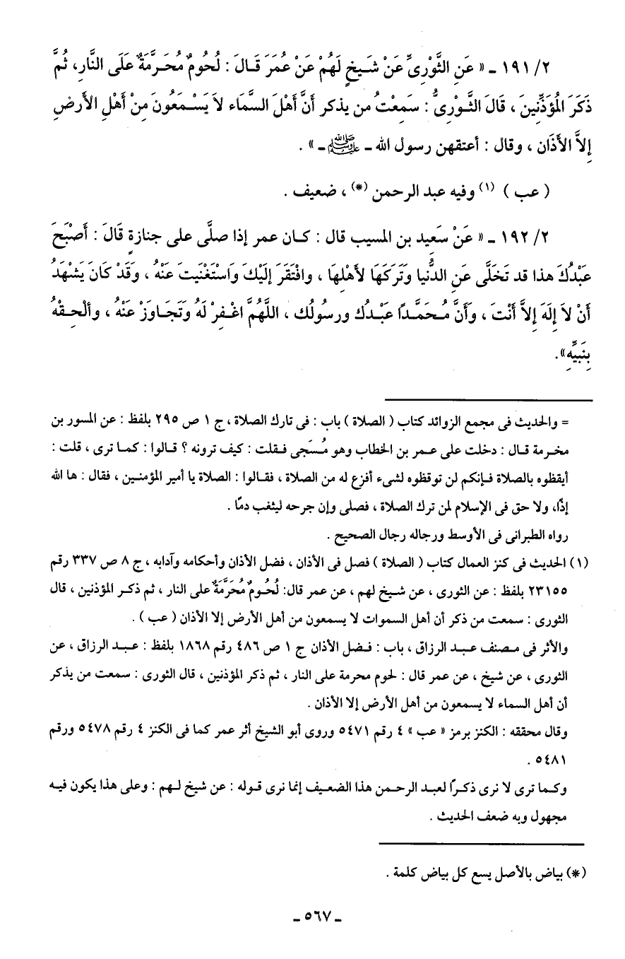 2/ 191 - "عَنِ الثَّوْرِىِّ عَنْ شَيخٍ لَهُمْ عَنْ عُمَرَ قَالَ: لُحُومٌ مُحَرَّمَةٌ عَلَى النَّارِ، ثُمَّ ذَكَرَ المُؤَذِّنِينَ، قَالَ الثَّوْرِىُّ: سَمِعْتُ من يذكر أَنَّ أَهْلَ السَّمَاء لَا يَسْمَعُونَ مِن أَهْلِ الأَرضِ إِلَّا الأَذَان، وقال: أعتقهن رسول الله - صلى الله عليه وسلم -".