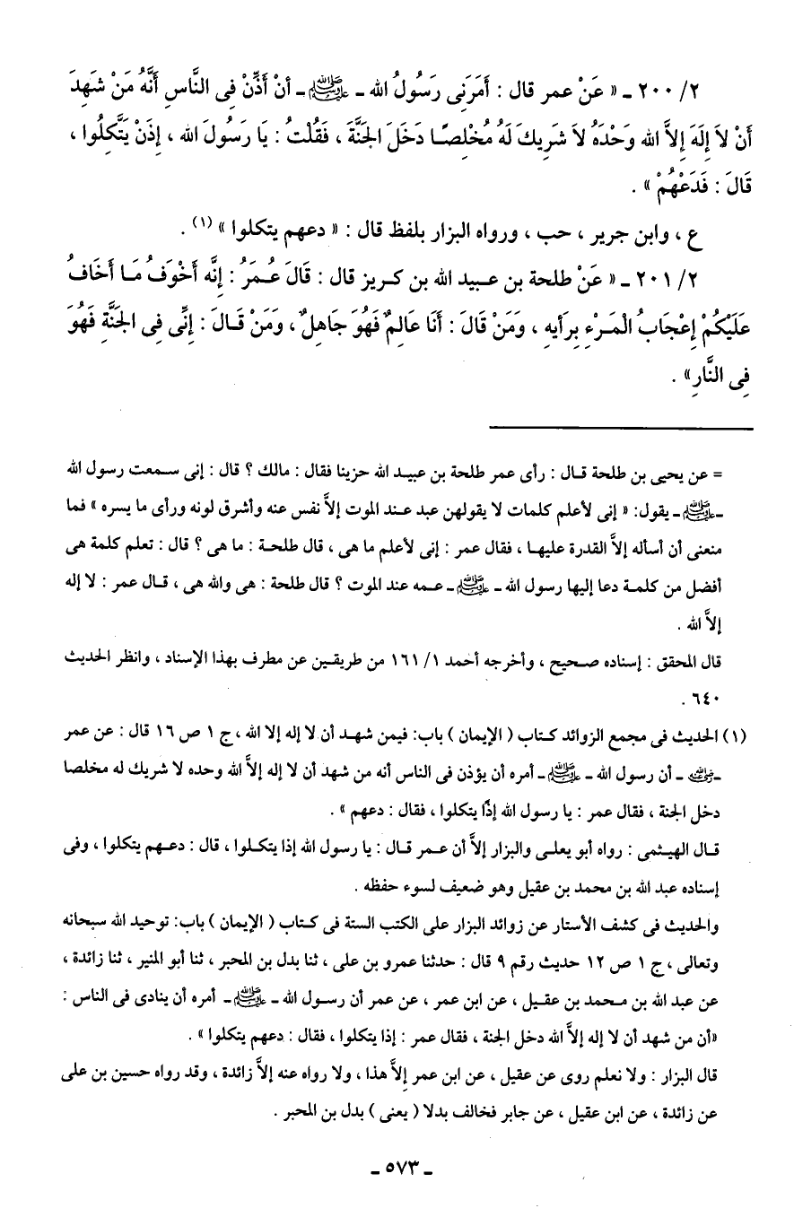 2/ 200 - "عَنْ عمر قال: أَمَرَنِى رَسُولُ الله - صلى الله عليه وسلم - أَنْ أَذِّنْ فِى النَّاسِ أَنَّهُ مَنْ شَهِدَ أَنْ لَا إِلَهَ إِلَّا الله وَحْدَه لَا شَرِيكَ لَهُ مُخْلِصًا دَخَلَ الجَنَّةَ، فَقُلْتُ: يَا رَسُولَ الله، إِذَنْ يَتَّكِلُوا، قَالَ: فَدَعْهُمْ".