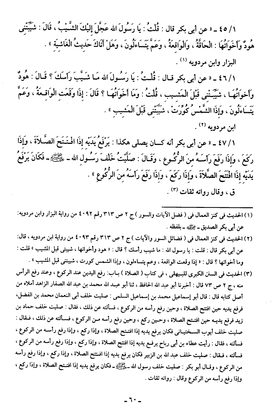 1/ 47 - "عن أَبى بكر أنه كان يصلى هكذا: يَرْفَعُ يَدَيْهِ إِذَا افْتَتَحَ الصَّلَاةَ، وَإِذَا رَكَعَ، وَإِذَا رَفَعَ رَأسَهُ مِنَ الرُّكُوع، وَقَالَ: صَلَّيْتُ خَلفَ رَسُولِ الله - صلى الله عليه وسلم - فَكَانَ يَرْفَعُ يَدَيْهِ إِذَا افْتَتَحَ الصَّلَاةَ، وَإِذَا رَكَعَ، وَإِذَا رَفَعَ رَأسَهُ مِنَ الرُّكُوعِ".