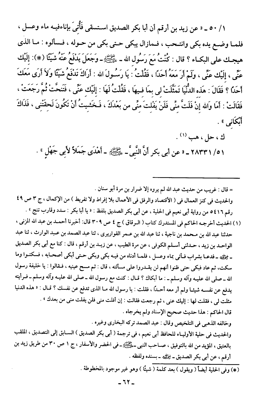 1/ 50 - "عن زيد بن أرقم أن أبا بكر الصديق استسقى فَأُتِىَ بإناء فيه ماء وعسل، فلما وضع يده بكى وانتحب، فما زال يبكى حتى بكى من حوله، فسألوه: ما الذى هيجك على البكاء؟ قال: كُنْتُ مَعَ رَسُولِ الله - صلى الله عليه وسلم - وَجَعَلَ يَدْفَعُ عَنْهُ شَيْئًا (*): إِلَيْك عَنِّى، إِلَيْك عَنِّى، وَلَمْ أَرَ مَعَهُ أَحَدًا، فَقُلْتُ: يَا رَسُولَ الله: أَرَاكَ تَدْفَعُ شَيْئًا وَلاَ أَرَى مَعَكَ أَحَدًا؟ فَقَالَ: هَذِهِ الدُّنْيَا تَمَثَّلَتْ لِى بِمَا فِيهَا، فَقُلْتُ لَهَا: إِلَيْكِ عَنِّى، فَتَنحَّتْ ثُمَّ رَجَعَتْ، فَقَالَتْ: أَمَا وَالله إِنْ فَلَتَّ مِنِّى فَلَنْ يَفْلِتَ مِنِّى من بَعْدَكَ، فَخَشِيتُ أَنْ تَكُونَ لَحِقَتْنِى، فَذَاكَ أَبْكَانِى".