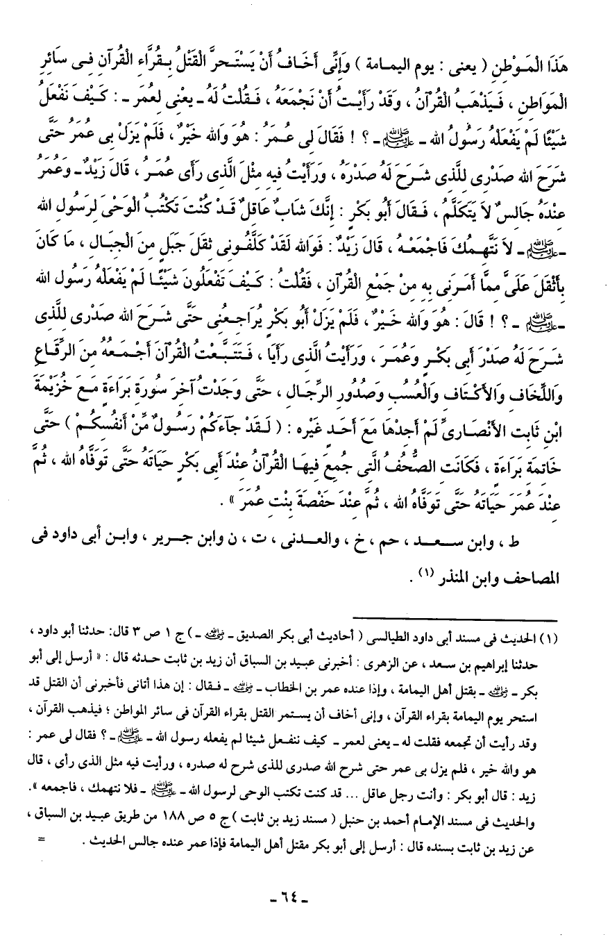 (¬1) الحديث في مسند أبى داود الطيالسى (أحاديث أبى بكر الصديق - رضي الله عنه -) ج 1 ص 3 قال: حدثنا أبو داود، حدثنا إبراهيم بن سعد، عن الزهرى: أخبرنى عبيد بن السباق أن زيد بن ثابت حدثه قال: "أرسل إلى أبو بكر - رضي الله عنه - بقتل أهل اليمامة، وإذا عنده عمر بن الخطاب - رضي الله عنه - فقال: إن هذا أتانى فأخبرنى أن القتل قد استحر يوم اليمامة بقراء القرآن، وإنى أخاف أن يستمر القتل بقراء القرآن في سائر المواطن؛ فيذهب القرآن، وقد رأيت أن تجمعه فقلت له - يعنى لعمر - كيف نفعل شيئًا لم يفعله رسول الله - صلى الله عليه وسلم -؟ فقال لى عمر: هو والله خير، فلم يزل بى عمر حتى شرح الله صدرى للذى شرح له صدره، ورأيت فيه مثل الذى رأى، قال زيد: قال أبو بكر: وأنت رجل عاقل ... قد كنت تكتب الوحى لرسول الله - صلى الله عليه وسلم - فلا نتهمك، فاجمعه". والحديث في مسند الإمام أحمد بن حنبل (مسند زيد بن ثابت) ج 5 ص 188 من طريق عبيد بن السباق، عن زيد بن ثابت بسنده قال: أرسل إلى أبو بكر مقتل أهل اليمامة فإذا عمر عنده جالس الحديث. =