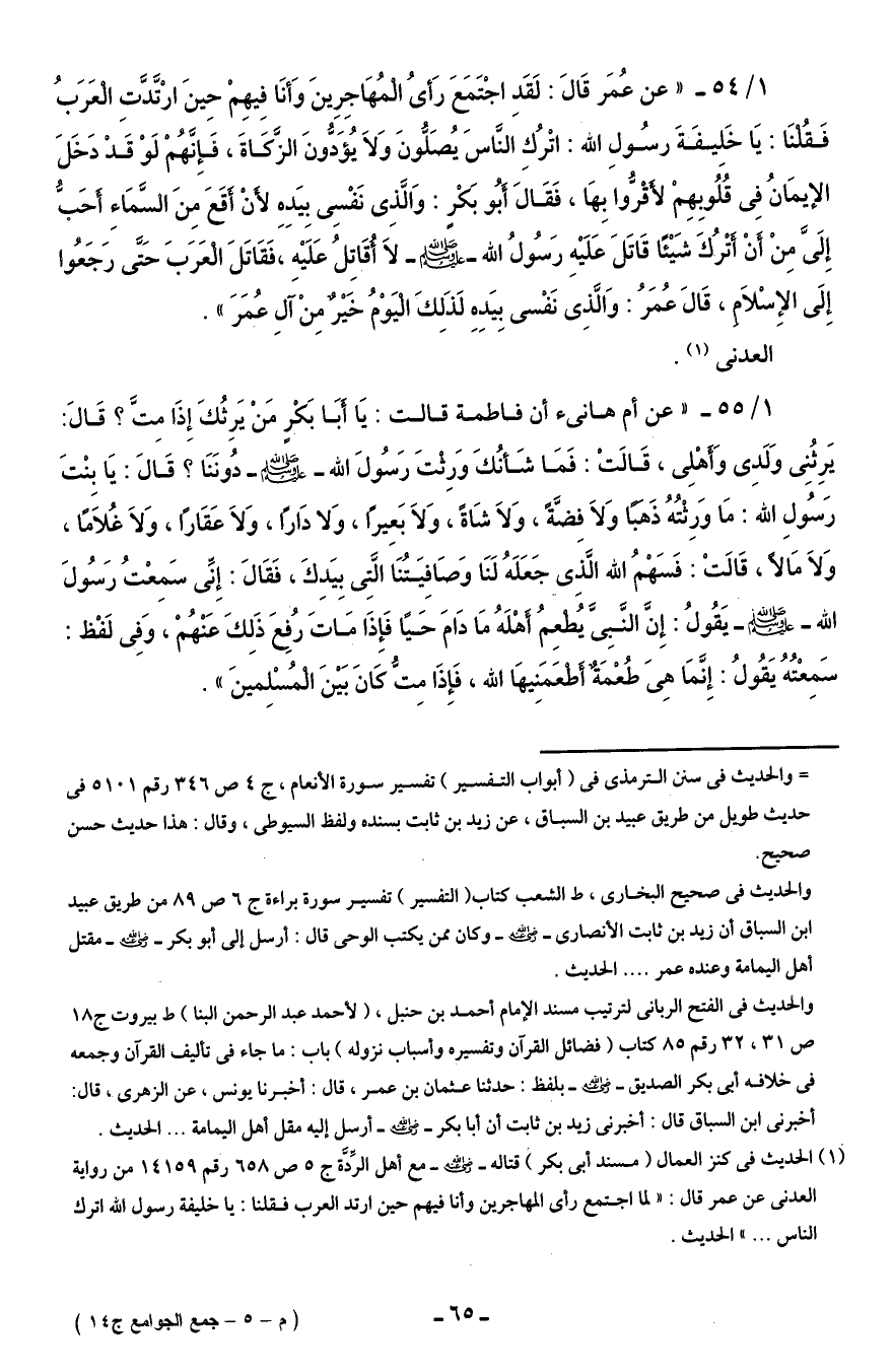 (¬1) الحديث في كنز العمال (مسند أبى بكر) قتاله - رضي الله عنه - مع أهل الرِّدَّة ج 5 ص 658 رقم 14159 من رواية العدنى عن عمر قال: "لما اجتمع رأى المهاجرين وأنا فيهم حين ارتد العرب فقلنا: يا خليفة رسول الله اترك الناس ... " الحديث.