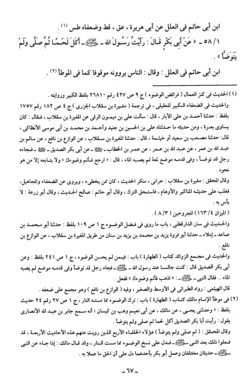 1/ 58 - "عَنْ أَبِى بَكْرٍ قَالَ: رَأَيْتُ رَسُولَ الله - صلى الله عليه وسلم - أَكَلَ لَحْمًا ثُمَّ صَلَّى وَلَمْ يَتَوَضَّأ".
