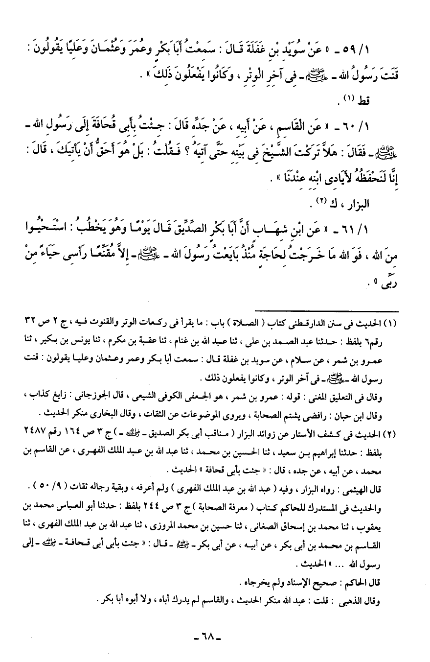 1/ 59 - "عَنْ سُوَيْدِ بْنِ غَفَلَةَ قَالَ: سَمِعْتُ أَبَا بكْرٍ وعمَرَ وَعُثْمَانَ وَعَلِيًا يَقُولُونَ: قَنَتَ رَسُولُ الله - صلى الله عليه وسلم - فِى آخِرِ الْوِترِ، وَكَانُوا يَفْعَلُونَ ذَلِكَ".