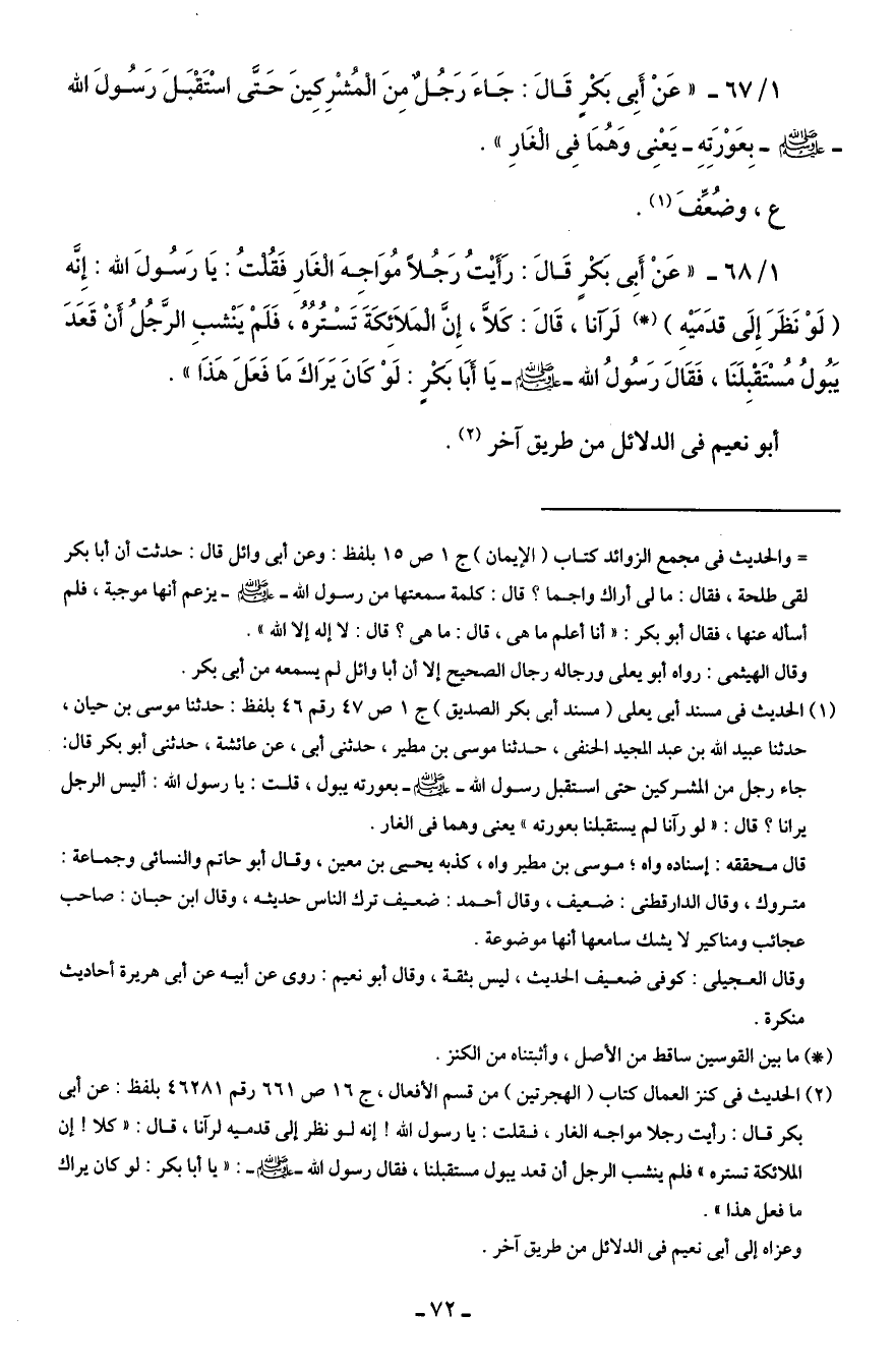 1/ 68 - "عَنْ أَبِى بَكْرٍ قَالَ: رَأَيْتُ رَجُلًا موَاجِهَ الْغَارِ فَقُلتُ: يَا رَسُولَ الله: إِنَّه (لَوْ نَظَرَ إِلَى قدَمَيْهِ) (*) لَرَآنا، قَالَ: كَلَّا، إِنَّ الْمَلَائِكَةَ تَسْتُرُةُ، فَلَمْ يَنْشبِ الرَّجُلُ أَنْ قَعَدَ يَبُولُ مُسْتَقْبِلَنَا، فَقَالَ رَسُولُ الله - صلى الله عليه وسلم - يَا أَبَا بَكْرٍ: لَوْ كَانَ يَرَاكَ مَا فَعَلَ هَذَا".