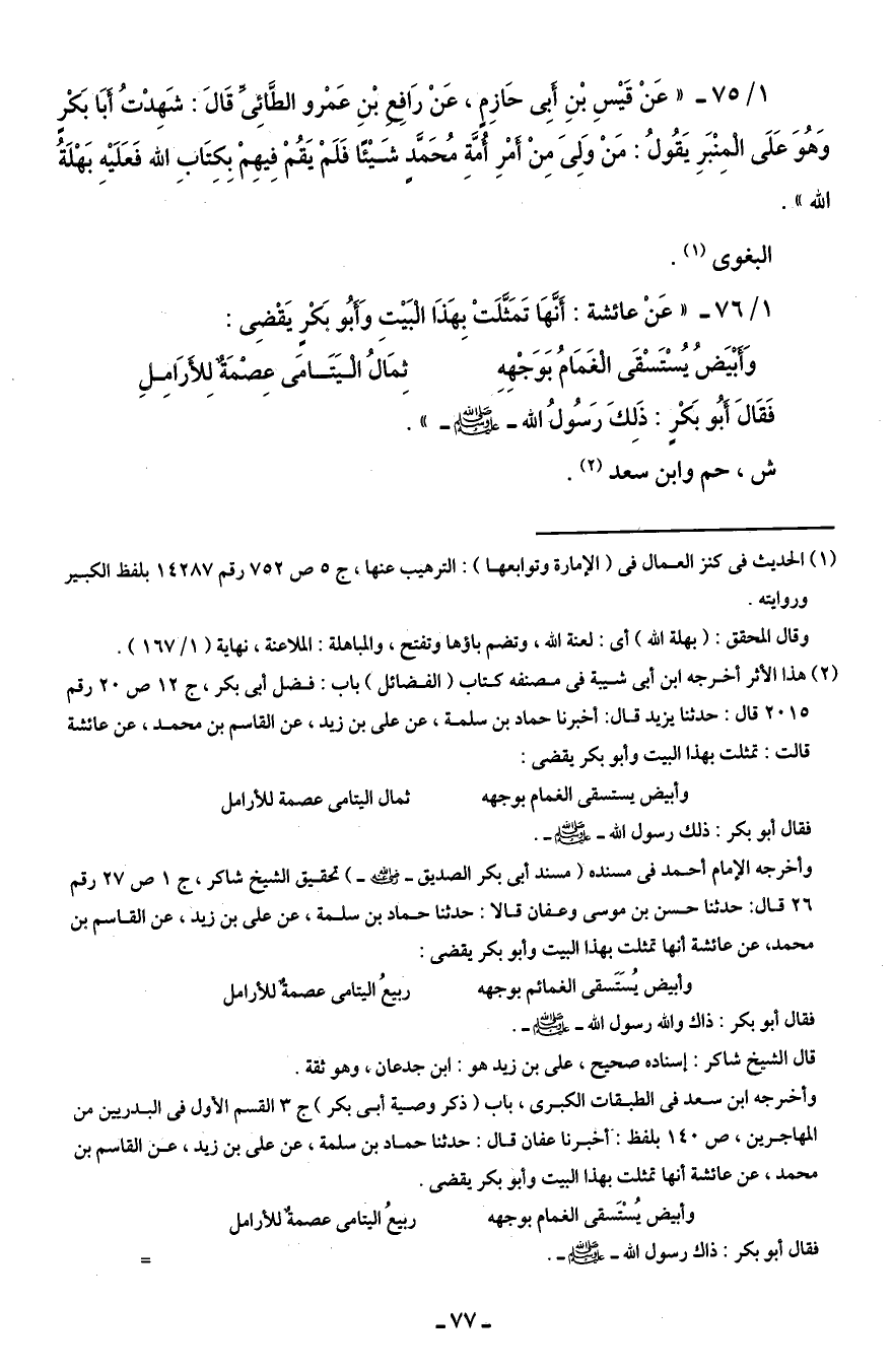 1/ 75 - "عَنْ قَيْسِ بْنِ أَبِى حَازِمٍ، عَنْ رَافِع بْنِ عَمْرو الطَّائِىِّ قَالَ: شَهِدْتُ أَبَا بَكْرٍ وَهُوَ عَلَى الْمِنْبَرِ يَقُولُ: مَنْ وَلِىَ مِنْ أَمْرِ أُمَّةِ مُحَمَّدٍ شَيْئًا فَلَمْ يَقُمْ فِيهِمْ بِكِتَابِ الله فَعَلَيْهِ بَهْلَةُ الله"