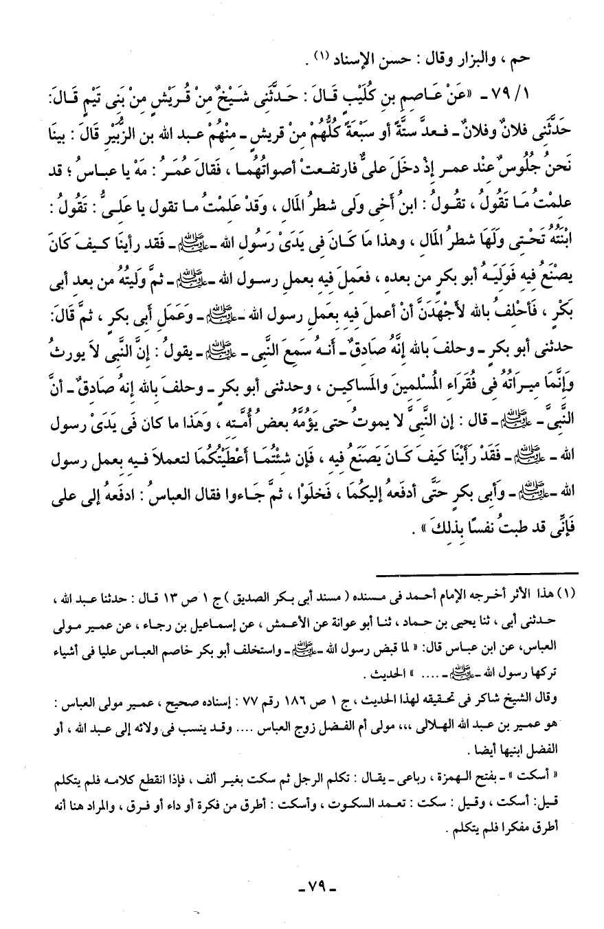 1/ 79 - "عَنْ عَاصِمِ بنِ كُلَيْبٍ قَالَ: حَدَّثَنِى شَيْخٌ مِنْ قُرَيْشٍ مِنْ بَنِى تَيْمٍ قَالَ: حَدَّثَنِى فلانٌ وفلانٌ - فعدَّ ستَّةً أو سَبْعَةً كُلُّهُمْ مِنْ قريشٍ - مِنْهُمْ عبد الله بن الزُّبَيْرِ قَالَ: بينَا نَحنُ جُلُوسٌ عِنْد عمر إِذْ دخَلَ علىٌّ فارتفعتْ أصواتُهُما، فَقالَ عُمَرُ: مَهْ يا عباسُ؛ قد علِمْتُ مَا تَقُولُ، تقُولُ: ابنُ أَخِى وَلى شطرُ المَالِ، وَقدْ عَلِمْتُ ما تقول يا عَلِىُّ: تَقُولُ: ابْنَتُهُ تَحْتِى وَلَهَا شطرُ المَالِ، وهذا مَا كَانَ فِى يَدَىْ رَسُولِ الله - صلى الله عليه وسلم - فَقد رأينَا كيفَ كَانَ يصْنَعُ فِيهِ فَوَلِيَهُ أبو بكرٍ من بعدهِ، فعَمِلَ فِيهِ بعملَ رسول الله - صلى الله عليه وسلم - ثمَّ وَليتُهُ من بعدِ أبى بَكْرٍ، فَأحْلِفُ بالله لأَجْهَدَنَّ أنْ أعملَ فِيه بِعَملِ رسول الله - صلى الله عليه وسلم - وَعَمَلِ أَبِى بكرٍ، ثمَّ قَالَ: حدثنى أبو بكرٍ - وحلفَ بالله إِنَّهُ صَادِقٌ - أَنهُ سَمِعَ النَّبِى - صلى الله عليه وسلم - يقولُ: إِنَّ النَّبِى لَا يورثُ وَإِنَّمَا مِيرَاثُهُ فِى فقَرَاءِ المُسْلِمينَ والمَساكِين، وحدثنى أبو بكرٍ - وحلفَ بِالله إِنهُ صَادِقٌ - أنَّ النَّبِىَّ - صلى الله عليه وسلم - قال: إن النَّبِىَّ لا يموتُ حتى يَؤُمَّهُ بعضُ أُمَّتِهِ، وَهَذا ما كان فَى يَدَىْ رسول الله - صلى الله عليه وسلم - فَقَدْ رَأَيْنَا كَيفَ كَانَ يَصَنَعُ فِيهِ، فَإن شِئْتُمَا أعْطَيْتُكُمَا لتعملَا فيهِ بِعمل رسول الله - صلى الله عليه وسلم - وَأبِى بكرٍ حَتَّى أدفَعهُ إليكُمَا، فَخلَوْا، ثمَّ جَاءوا فقال العباسُ: ادفَعهُ إلى على فَإنِّى قد طبتُ نفسًا بِذلِكَ".