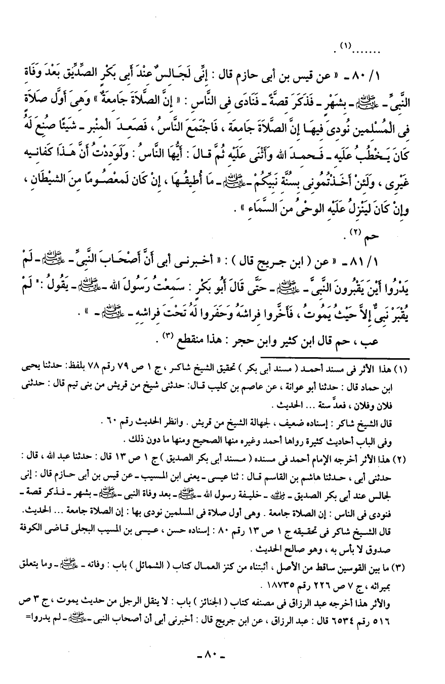 1/ 80 - "عن قيس بن أبى حازم قال: إِنِّى لَجَالِسٌ عِنْدَ أَبِى بَكْرٍ الصِّدِّيق بَعْدَ وَفَاةِ النَّبِىِّ - صلى الله عليه وسلم - بِشَهْرٍ - فَذَكَرَ قِصَّةً - فَنَادَى فِى النَّاسِ: "إِنَّ الصَّلَاةَ جَامِعَةٌ" وَهِىَ أوَّل صَلَاة فِى الْمُسْلِمين نُودِىَ فِيهَا إِنَّ الصَّلَاةَ جَامِعَة، فَاجْتَمَعَ النَّاسُ، فَصَعِدَ الْمِنْبر - شَيئًا صُنِعَ لَهُ كَانَ يَخْطُبُ عَلَيهِ - فَحمِدَ الله وَأَثْنَى عَلَيْه ثُمَّ قالَ: أَيُّهَا النَّاسُ: وَلَوَدِدْتُ أَنَّ هَذَا كَفانِيه غَيْرِى، وَلَئِنْ أخَذْتُمُونِى بِسُنَّةِ نَبِيَّكُمْ - صلى الله عليه وسلم - مَا أُطِيقُهَا، إِنْ كَان لَمعْصُومًا مِنَ الشيْطَانِ، وإِنْ كَانَ ليَنْزِلُ عَلَيْهِ الوحْىُ منَ السَّمَاءِ".