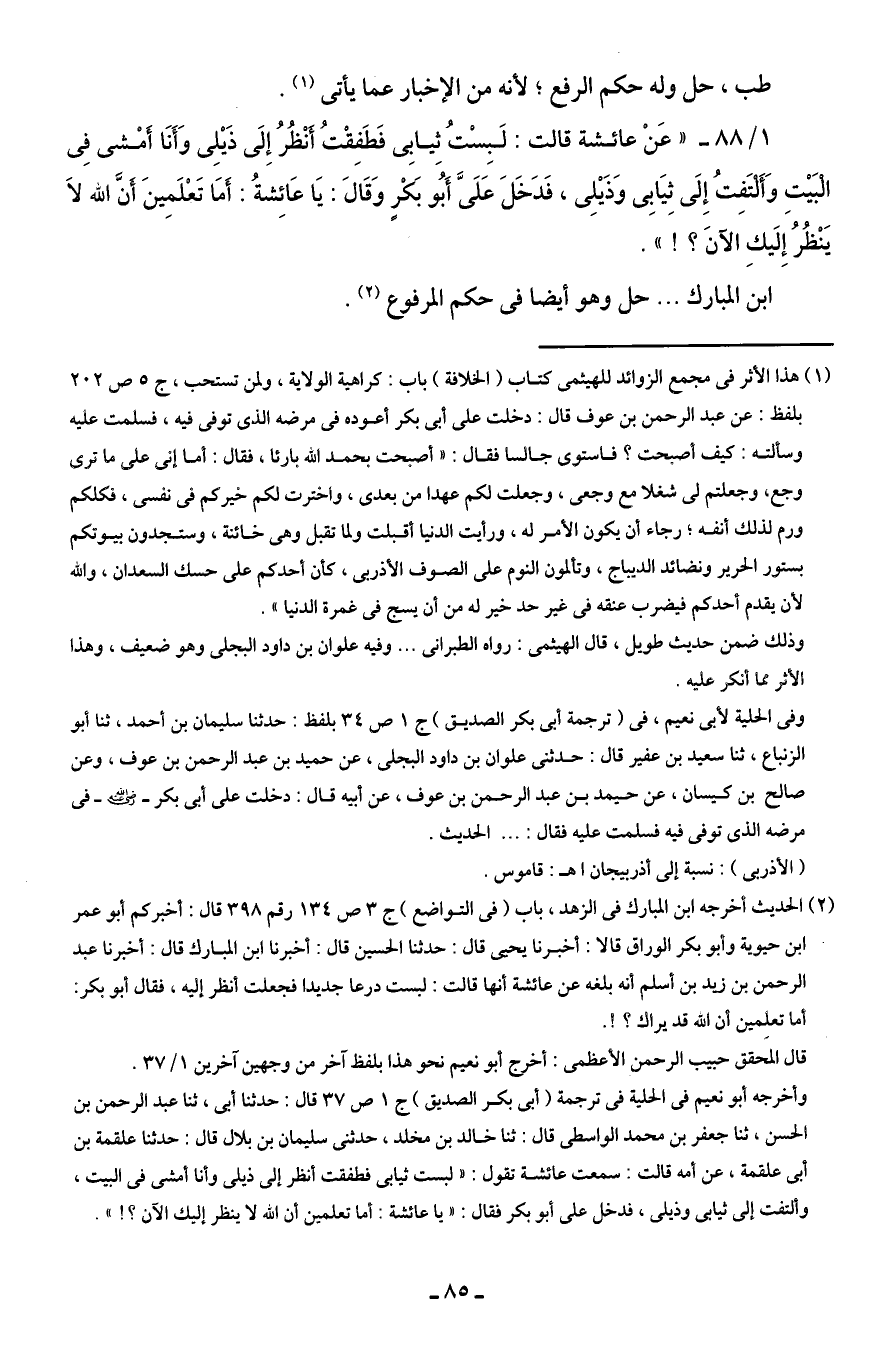 (¬1) هذا الأثر في مجمع الزوائد للهيثمى كتاب (الخلافة) باب: كراهية الولاية، ولمن تستحب، ج 5 ص 202 بلفظ: عن عبد الرحمن بن عوف قال: دخلت على أبى بكر أعوده في مرضه الذى توفى فيه، فسلمت عليه وسألته: كيف أصبحت؟ فاستوى جالسا فقال: "أصبحت بحمد الله بارئا، فقال: أما إنى على ما ترى وجع، وجعلتم لى شغلا مع وجعى، وجعلت لكم عهدا من بعدى، واخترت لكم خيركم في نفسى، فكلكم ورم لذلك أنفه؛ رجاء أن يكون الأمر له، ورأيت الدنيا أقبلت ولما تقبل وهى خائنة، وستجدون بيوتكم بستور الحرير ونضائد الديباج، وتألمون النوم على الصوف الأذربى، كأن أحدكم على حسك السعدان، والله لأن يقدم أحدكم فبضرب عنقه في غير حد خير له من أن يسج في غمرة الدنيا".
