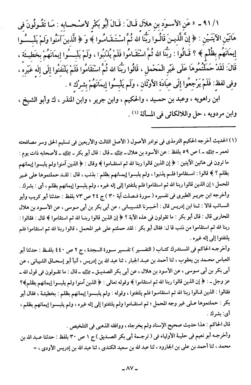 1/ 91 - "عَنِ الأسوَدِ بِنِ هِلَالٍ قَالَ: قَالَ أَبُو بَكْرٍ لأصْحابِهِ: مَا تَقُولُونَ فِى هَاتَيْنِ الآيَتَيْنِ: {إِنَّ الَّذِينَ قَالُوا رَبُّنَا الله ثُمَّ اسْتَقَامُوا} وَ {الَّذِينَ آمَنُوا وَلَمْ يَلْبِسُوا إِيمَانَهُمْ بِظُلْمٍ}؟ قَالُوا: رَبُّنَا الله ثُمَّ اسْتَقَامُوا فَلَمْ يُذْنِبُوا، وَلَمْ يَلبِسُوا إِيمَانَهُمْ بِخَطِيئَةٍ، قَالَ: لَقَدْ حَمَلْتُمُوهَا عَلَى غَيْرِ الْمَحْملِ، قَالُوا رَبُّنَا الله ثُمَّ اسْتَقَامُوا فَلَمْ يَلتَفِتُوا إِلَى إِلَهٍ غَيْرِهِ، وفِى لفظٍ: فَلَمْ يَرْجِعُوا إِلَى عِبَادَةِ الأَوْثَانِ، وَلَم يَلبِسُوا إِيمَانَهُمْ بِشِرْكٍ".