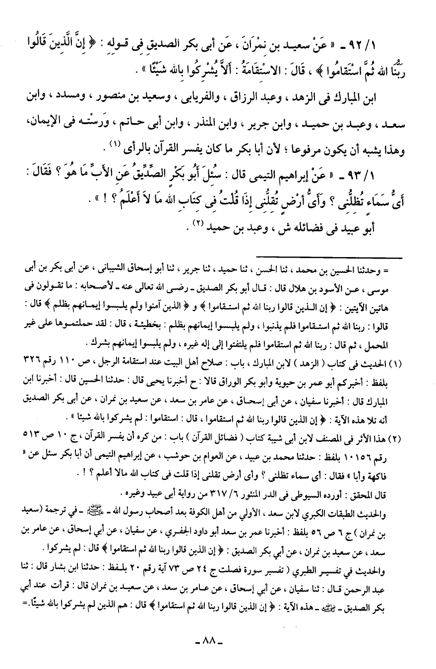 1/ 92 - "عَن سعيد بن نِمْرَانَ، عَن أبى بكر الصديقِ فِى قولِهِ: {إِنَّ الَّذِينَ قَالُوا رَبُّنَا الله ثُمَّ اسْتَقَامُوا}، قَالَ: الاسْتِقَامَةُ: أَلَّا يُشْرِكُوا بِالله شَيْئًا".