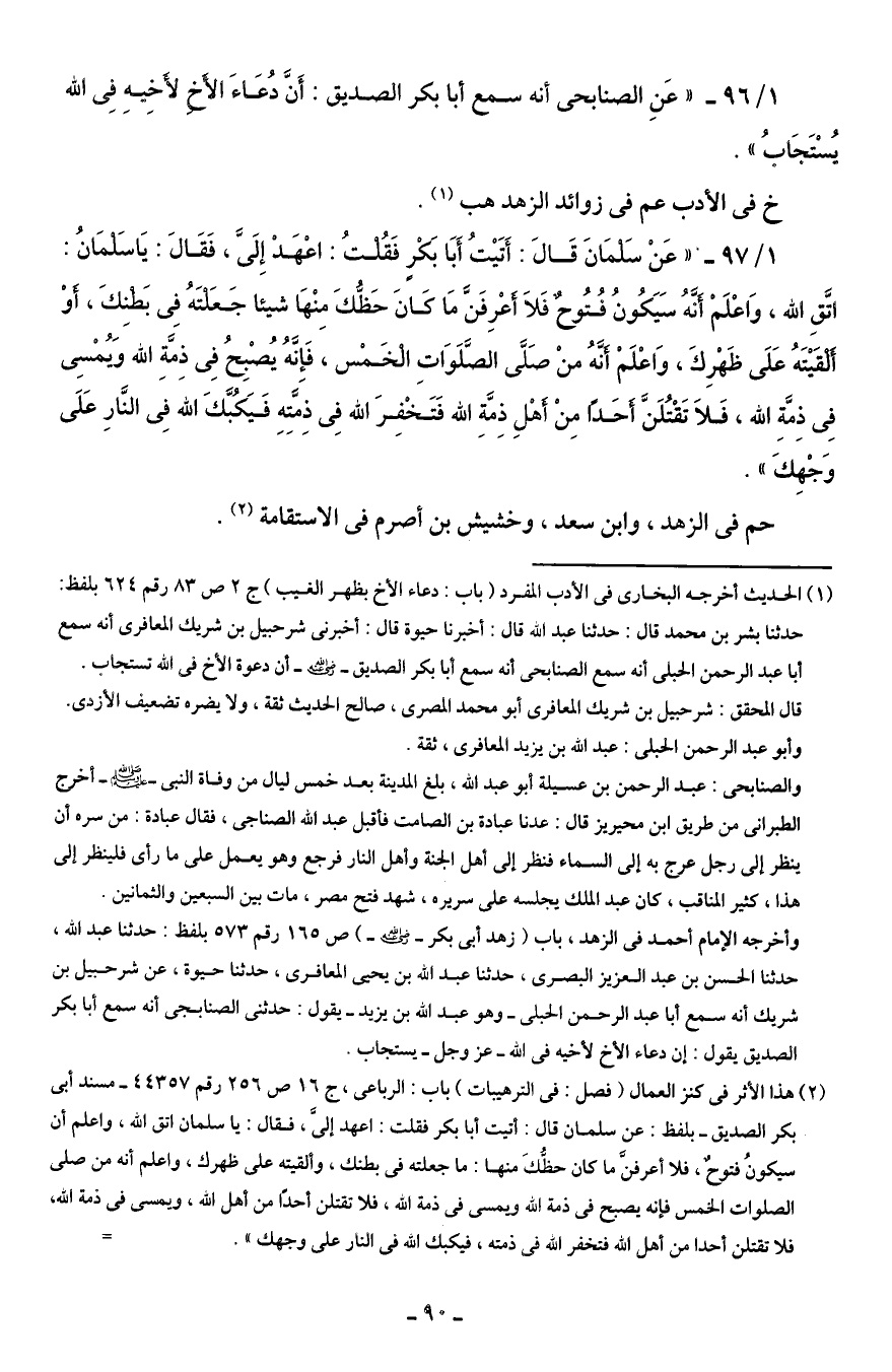 1/ 96 - "عَنِ الصنابحى أنه سمع أبا بكر الصديق: أَنَّ دُعَاءَ الأَخِ لأَخِيهِ فِى الله يُسْتَجَابُ".