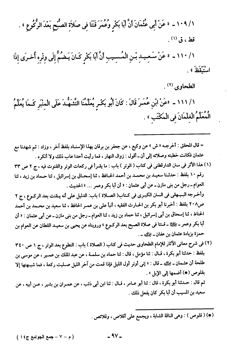 1/ 109 - "عَنْ أبِى عُثْمَانَ أنَّ أَبَا بَكْرٍ وُعُمَرَ قَنَتَا فِى صَلَاةِ الصُّبْحِ بَعْدَ الرُّكُوعِ".