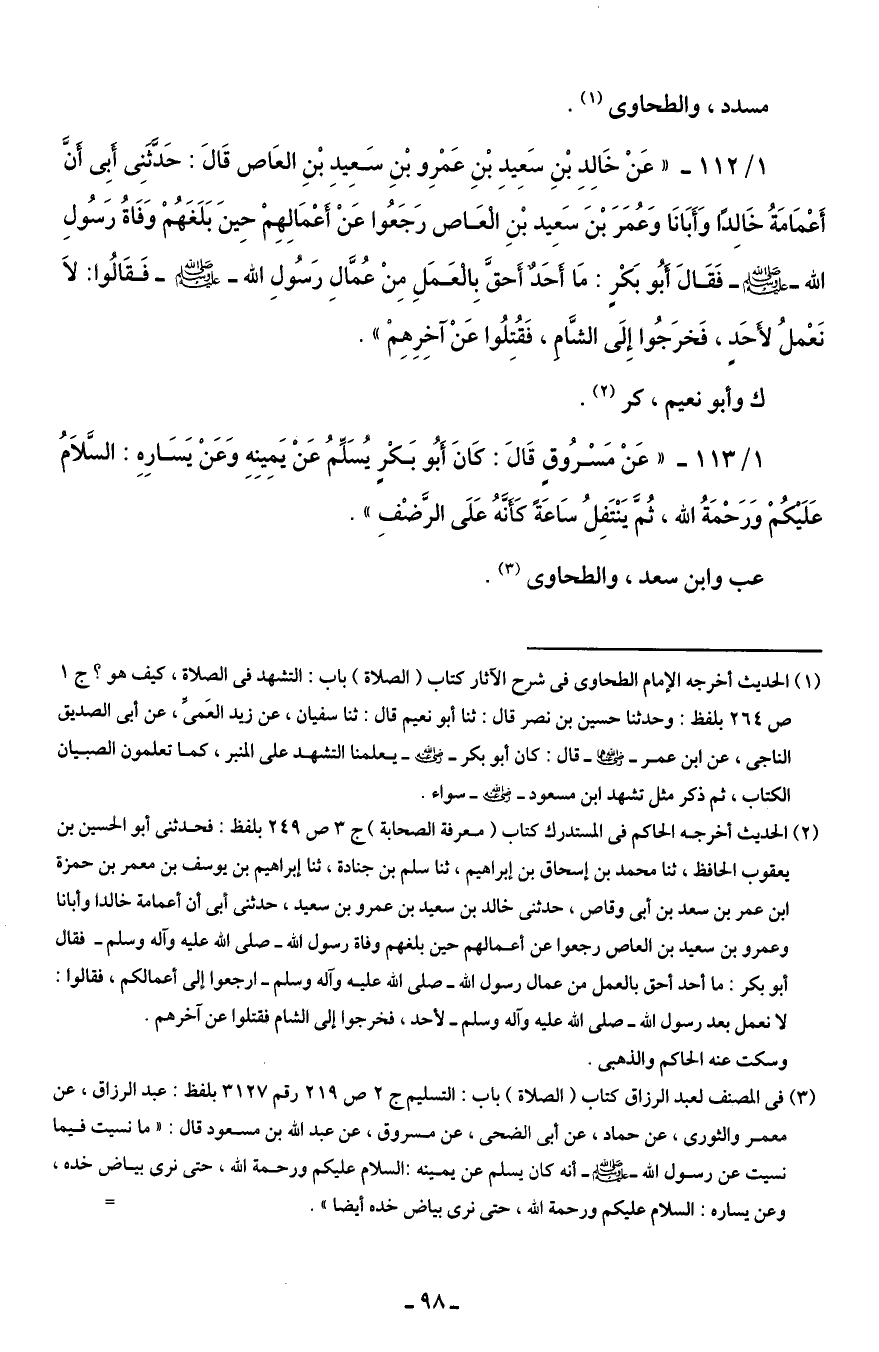 1/ 112 - "عَنْ خَالِدِ بْنِ سَعِيدِ بْنِ عَمْرِو بْنِ سَعِيدِ بْنِ العَاص قَالَ: حَدَّثَنِى أَبِى أنَّ أَعْمَامَةُ خَالِدًا وَأَبَانَا وَعُمَرَ بْنَ سَعِيد بْنِ الْعَاص رَجَعُوا عَنْ أَعْمَالِهِمْ حِينَ بَلَغَهُمْ وَفَاةُ رَسُولِ الله - صلى الله عليه وسلم - فَقَالَ أَبُو بَكْرٍ: مَا أحَدٌ أَحقَّ بِالعَمَلِ مِنْ عُمَّالِ رَسولِ الله - صلى الله عليه وسلم - فَقَالُوا: لَا نَعْملُ لأَحَدٍ، فَخرَجُوا إِلَى الشَّامِ، فَقُتِلُوا عَنْ آخِرِهمْ".