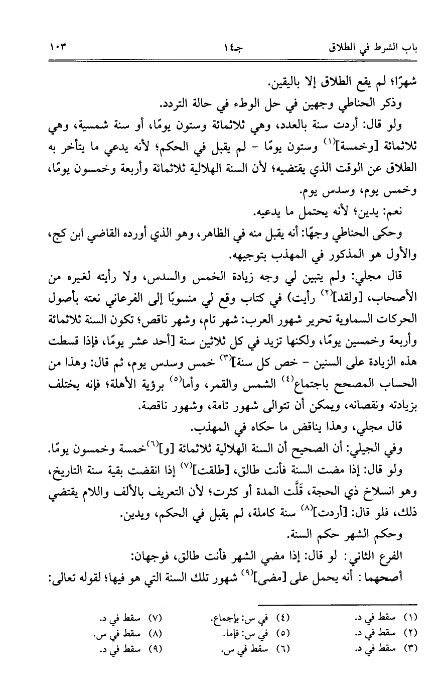 قال مجلي: ولم يتبين لي وجه زيادة الخمس والسدس، ولا رأيته لغيره من الأصحاب، [ولقد] رأيت) في كتاب وقع لي منسوباً إلى الفرعاني نعته بأصول الحركات السماوية تحرير شهور العرب: شهر تام، وشهر ناقص؛ تكون السنة ثلاثمائة وأربعة وخمسين يوماً، ولكنها تزيد في كل ثلاثين سنة [أحد عشر يوماً، فإذا قسطت هذه الزيادة على السنين- خص كل سنة] خمس وسدس يوم، ثم قال: وهذا من الحساب المصحح باجتماع الشمس والقمر، وأما برؤية الأهلة؛ فإنه يختلف بزيادته ونقصانه، ويمكن أن تتوالى شهور تامة، وشهور ناقصة.