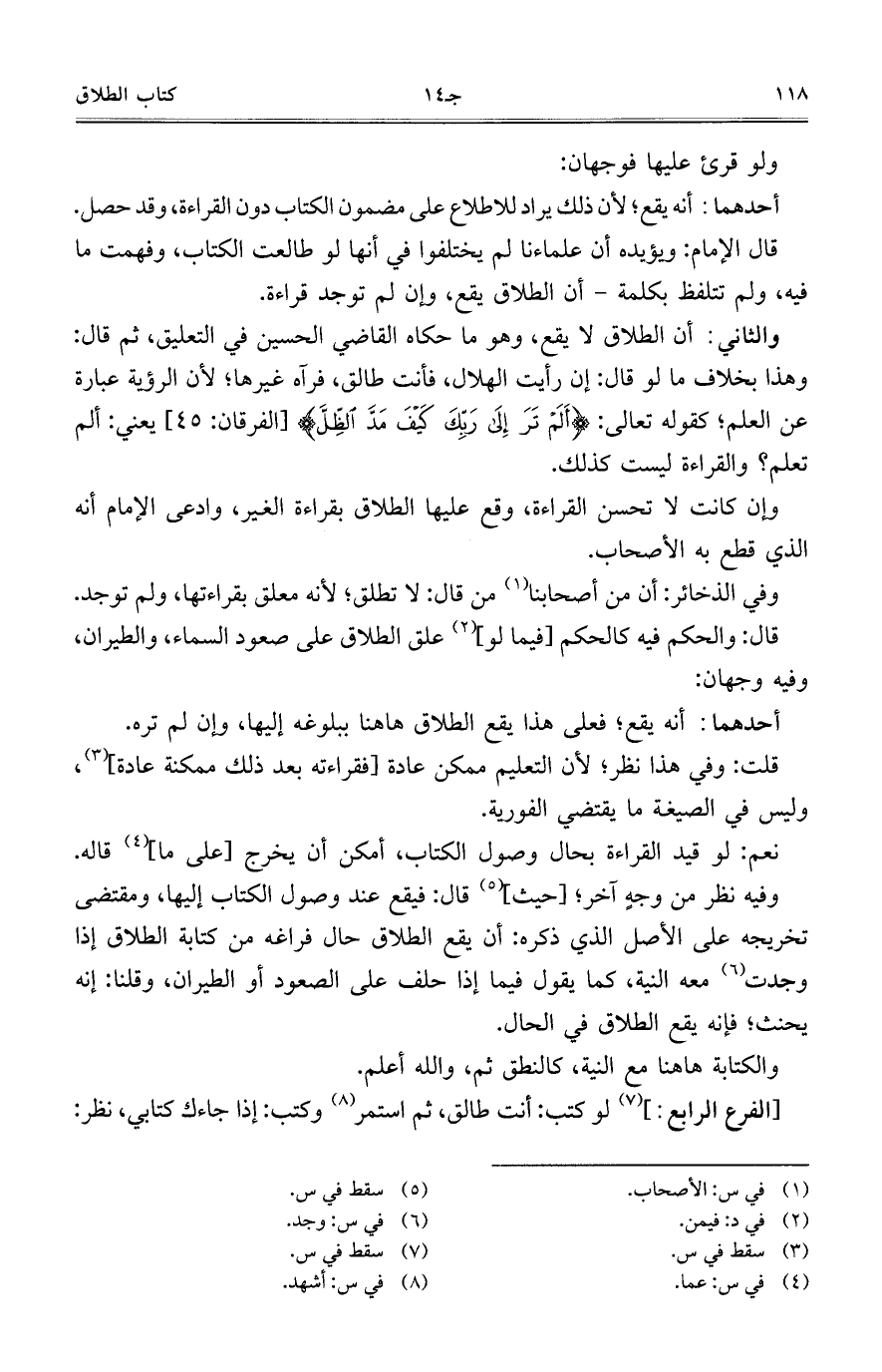 قال الإمام: ويؤيده أن علماءنا لم يختلفوا في أنها لو طالعت الكتاب، وفهمت ما فيه، ولم تتلفظ بكلمة- أن الطلاق يقع، وإن لم توجد قراءة.
