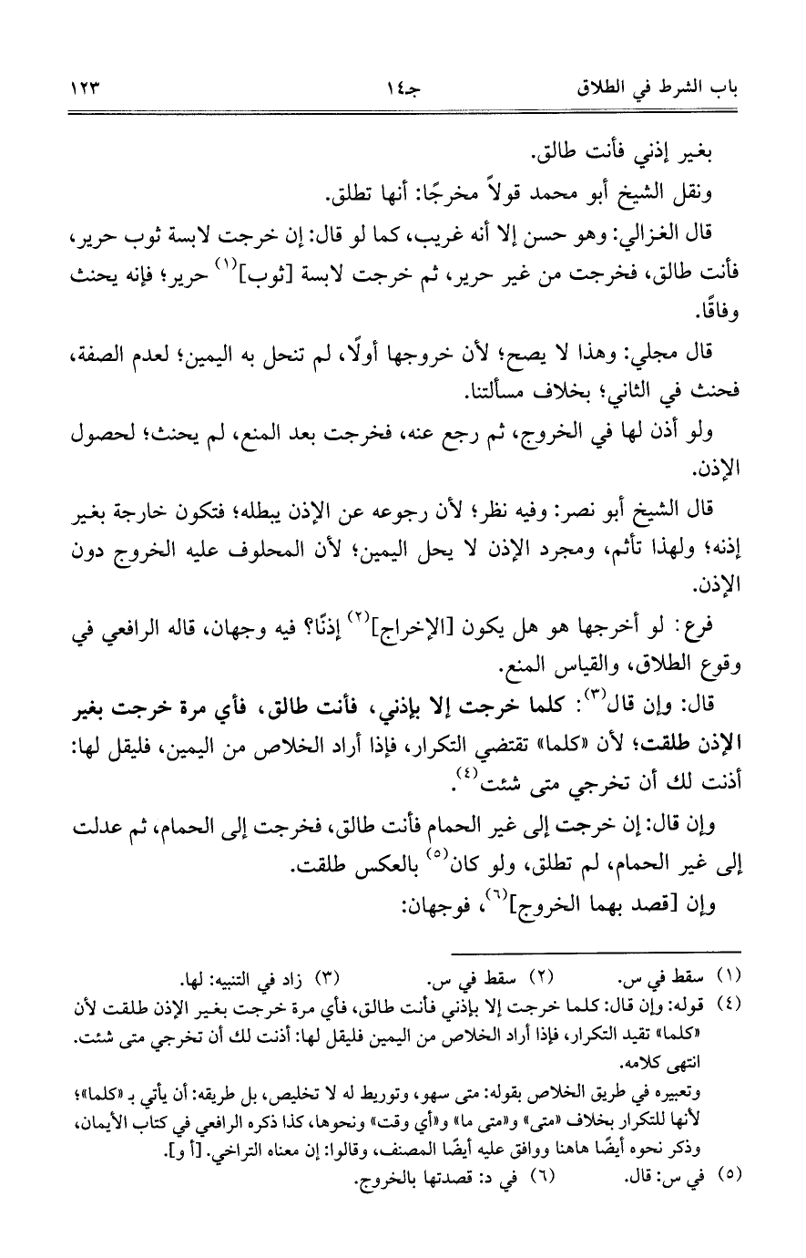 قال الشيخ أبو نصر: وفيه نظر؛ لأن رجوعه عن الإذن يبطله؛ فتكون خارجة بغير إذنه؛ ولهذا تأثم، ومجرد الإذن لا يحل اليمين؛ لأن المحلوف عليه الخروج دون الإذن.