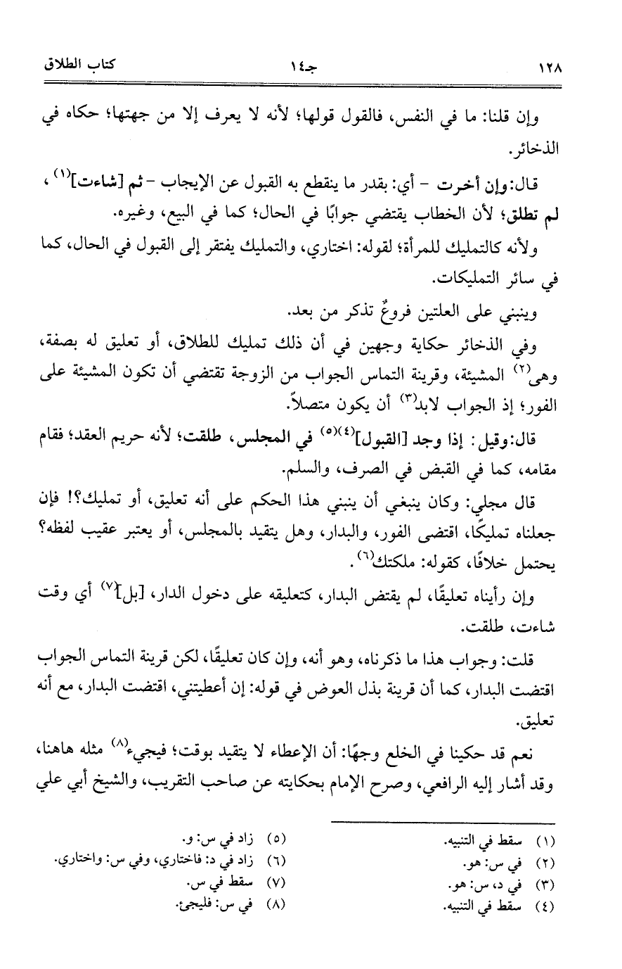 وفي الذخائر حكاية وجهين في أن ذلك تمليك للطلاق، أو تعليق له بصفة، وهي المشيئة، وقرينة التماس الجواب من الزوجة تقتضي أن تكون المشيئة على الفور؛ إذ الجواب لابد أن يكون متصلاً.