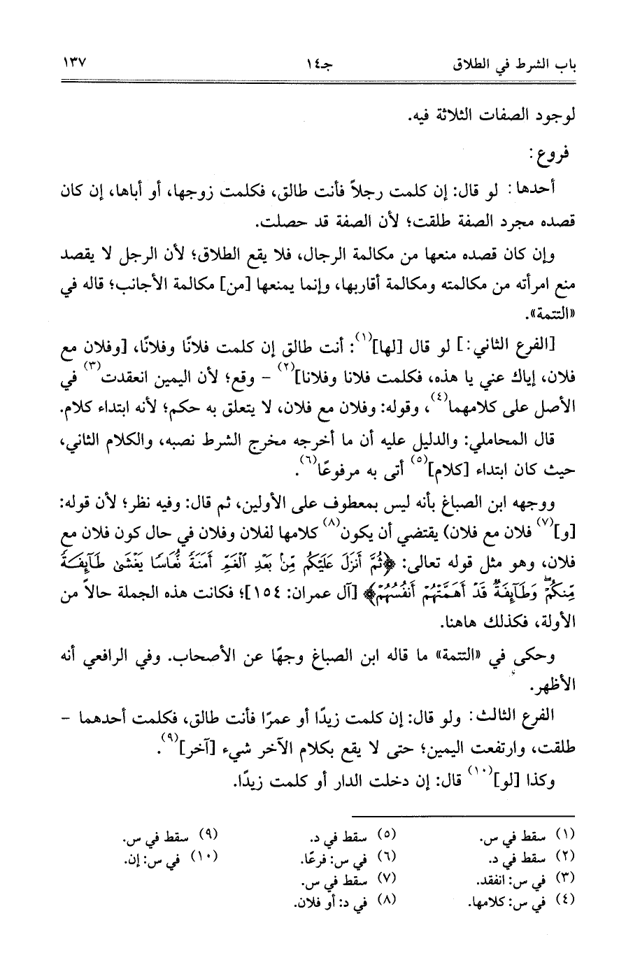 ووجهه ابن الصباغ بأنه ليس بمعطوف على الأولين، ثم قال: وفيه نظر؛ لأن قوله: [و] فلان مع فلان) يقتضي أن يكون كلامها لفلان وفلان في حال كون فلان مع فلان، وهو مثل قوله تعالى: {ثُمَّ أَنْزَلَ عَلَيْكُمْ مِنْ بَعْدِ الْغَمِّ أَمَنَةً نُعَاساً يَغْشَى طَائِفَةً مِنْكُمْ وَطَائِفَةٌ قَدْ أَهَمَّتْهُمْ أَنْفُسُهُمْ} [آل عمران: 154]؛ فكانت هذه الجملة حالاً من الأولة، فكذلك ها هنا.