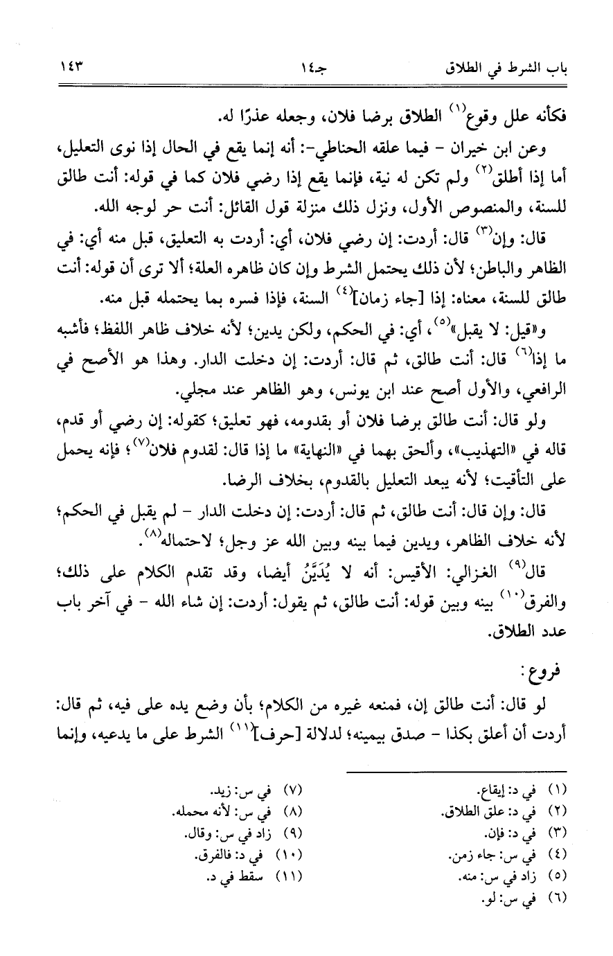 وعن ابن خيران- فيما علقه الحناطي-: أنه إنما يقع في الحال إذا نوى التعليل، أما إذا أطلق ولم تكن له نية، فإنما يقع إذا رضي فلان كما في قوله: أنت طالق للسنة، والمنصوص الأول، ونزل ذلك منزلة قول القائل: أنت حر لوجه الله.