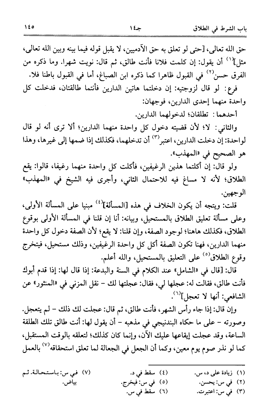حق الله تعالى، [حتى لو تعلق به حق الآدميين، لا يقبل قوله فيما بينه وبين الله تعالى، مثل] أن يقول: إن كلمت فلاناً فأنت طالق، ثم قال: نويت شهراً. وما ذكره من الفرق حسن في القبول ظاهراً كما ذكره ابن الصباغ، أما في القبول بطناً فلا.
