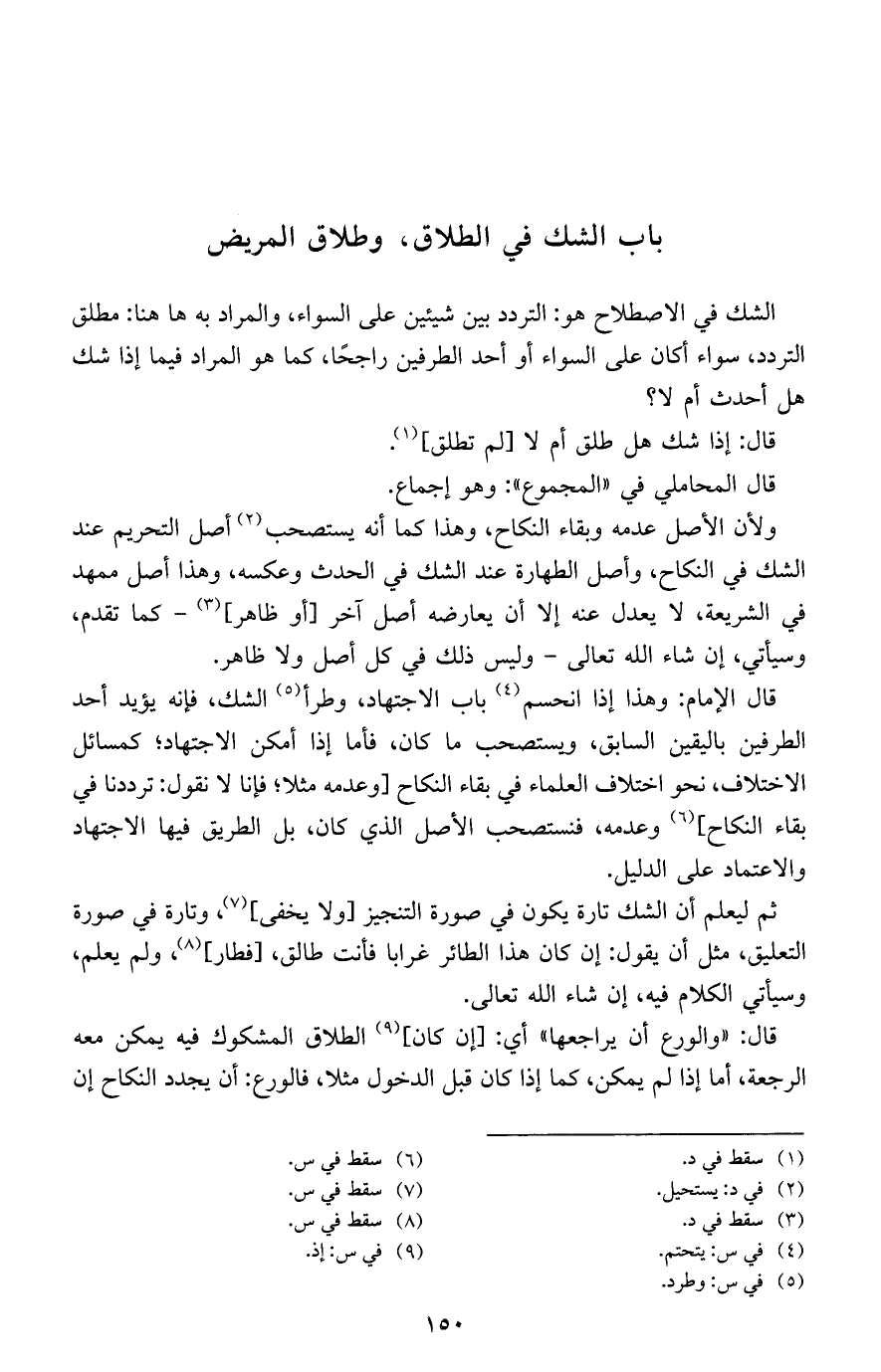 قال الإمام: وهذا إذا انحسم باب الاجتهاد، وطرأ الشك، فإنه يؤيد أحد الطرفين باليقين السابق، ويستصحب ما كان، فأما إذا أمكن الاجتهاد؛ كمسائل الاختلاف، نحو اختلاف العلماء في بقاء النكاح [وعدمه مثلاً؛ فإنا لا نقول: ترددنا في بقاء النكاح] وعدمه، فنستصحب الأصل الذي كان، بل الطريق فيها الاجتهاد والاعتماد على الدليل.