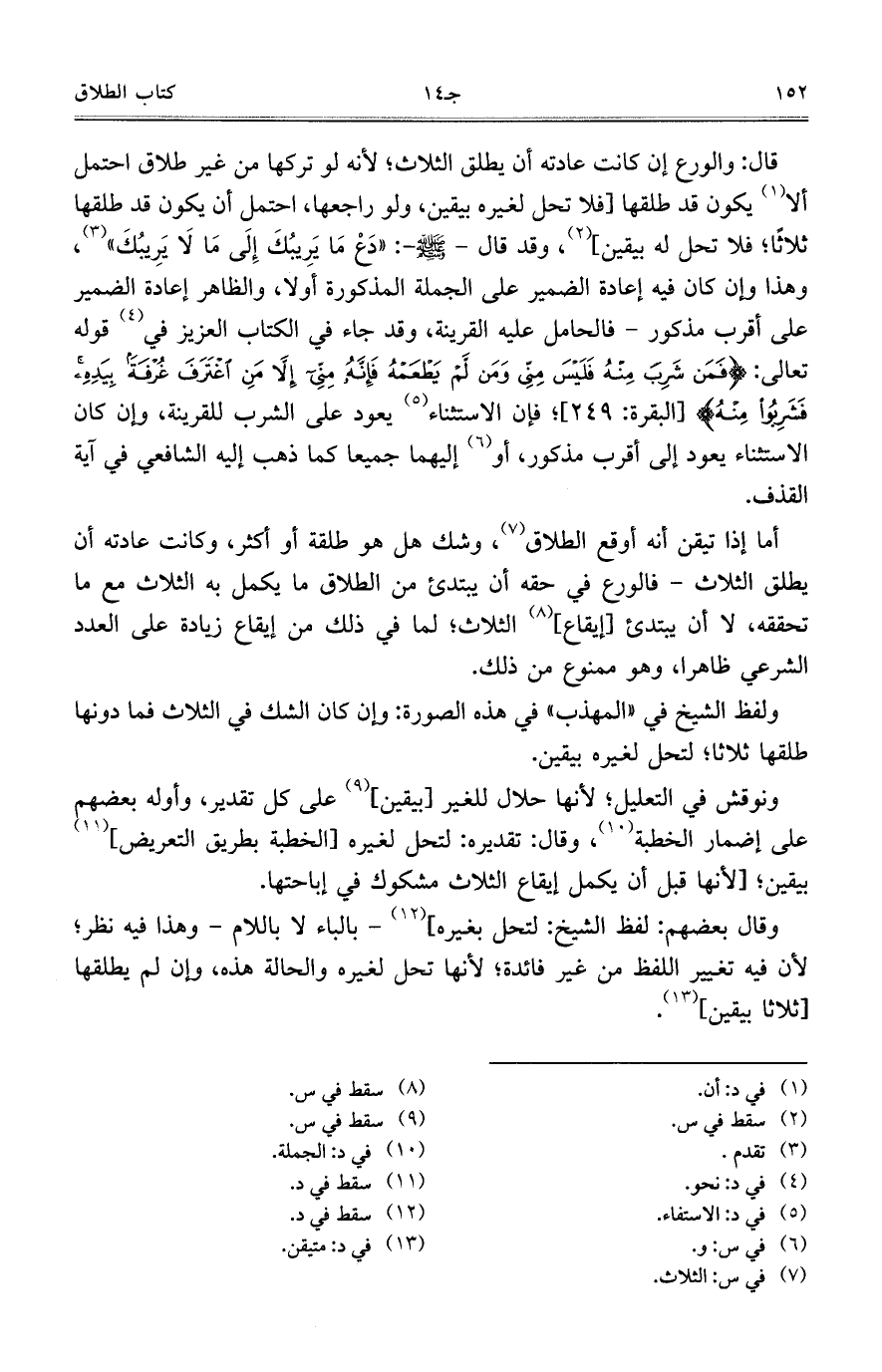 قال: والورع إن كانت عادته أن يطلق الثلاث؛ لأنه لو تركها من غير طلاق احتمل ألا يكون قد طلقها [فلا تحل لغيره بيقين، ولو راجعها، احتمل أن يكون قد طلقها ثلاثاً؛ فلا تحل له بيقين]، وقد قال- صلى الله عليه وسلم-: "دَعْ مَا يَرِيبُكَ إِلَى مَا لَا يَرِيبُكَ"، وهذا وإن كان فيه إعادة الضمير على الجملة المذكورة أولاً، والظاهر إعادة الضمير على أقرب مذكور- فالحامل عليه القرينة، وقد جاء في الكتاب العزيز في قوله تعالى: {فَمَنْ شَرِبَ مِنْهُ فَلَيْسَ مِنِّي وَمَنْ لَمْ يَطْعَمْهُ فَإِنَّهُ مِنِّي إِلاَّ مَنْ اغْتَرَفَ غُرْفَةً بِيَدِهِ فَشَرِبُوا مِنْهُ} [البقرة: 249]؛ فإن الاستثناء يعود على الشرب للقرينة، وإن كان الاستثناء يعود إلى أقرب مذكور، أو إليهما جميعاً كما ذهب إليه الشافعي في آية القذف.