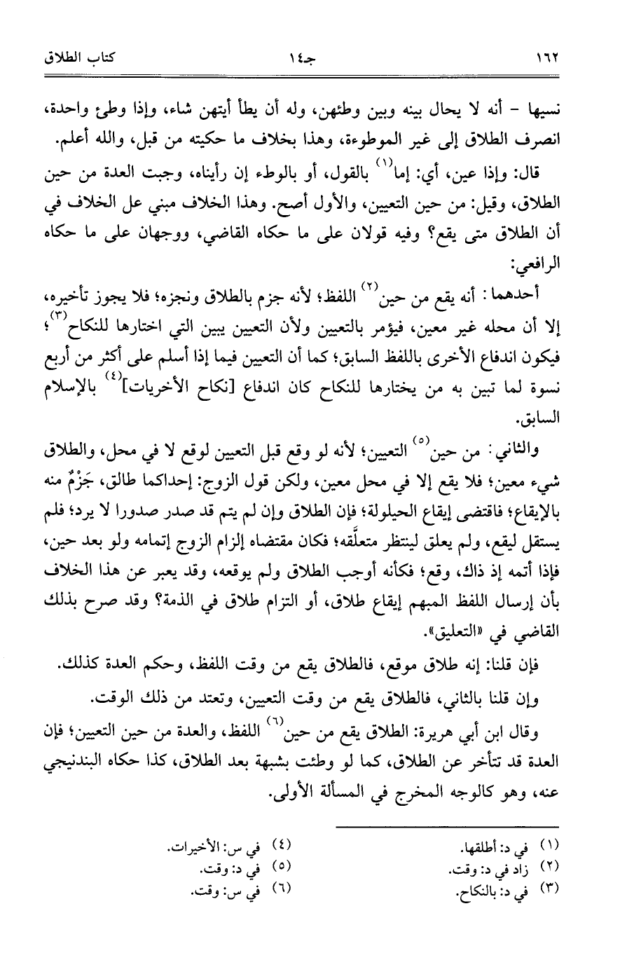 والثاني: من حين التعيين؛ لأنه لو وقع قبل التعيين لوقع لا في محل، والطلاق شيء معين؛ فلا يقع إلا في محل معين، ولكن قول الزوج: إحداكما طالق، جَزْمٌ منه بالإيقاع؛ فاقتضى إيقاع الحيلولة؛ فإن الطلاق وإن لم يتم قد صدر صدوراً لا يرد؛ فلم يستقل ليقع، ولم يعلق لينتظر متعلَّقه؛ فكان مقتضاه إلزام الزوج إتمامه ولو بعد حين، فإذا أتمه إذ ذاك، وقع؛ فكأنه أوجب الطلاق ولم يوقعه، وقد يعبر عن هذا الخلاف بأن إرسال اللفظ المبهم إيقاع طلاق، أو التزام طلاق في الذمة؟ وقد صرح بذلك القاضي في "التعليق".