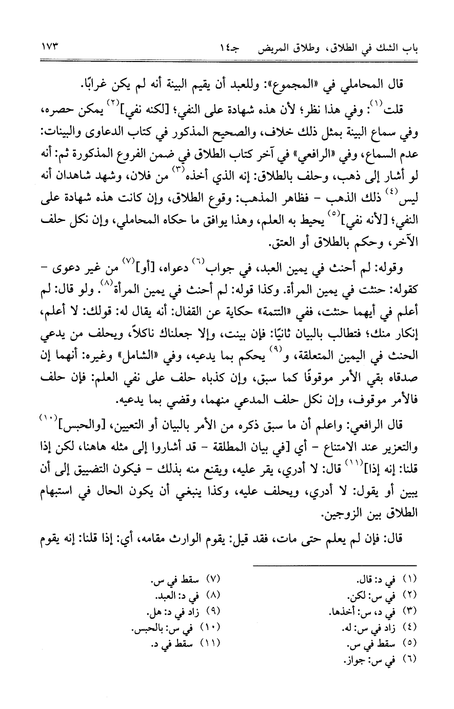 وقوله: لم أحنث في يمين العبد، في جواب دعواه، [أو] من غير دعوى- كقوله: حنثت في يمين المرأة. وكذا قوله: لم أحنث في يمين المرأة. ولو قال: لم أعلم في أيهما حنثت، ففي "التتمة" حكاية عن القفال: أنه يقال له: قولك: لا أعلم، إنكار منك؛ فتطالب بالبيان ثانياً: فإن بينت، وإلا جعلناك ناكلاً، ويحلف من يدعي الحنث في اليمين المتعلقة، ويحكم بما يدعيه، وفي "الشامل" وغيره: أنهما إن صدقاه بقي الأمر موقوفاً كما سبق، وإن كذباه حلف على نفي العلم: فإن حلف فالأمر موقوف، وإن نكل حلف المدعي منهما، وقضي بما يدعيه.