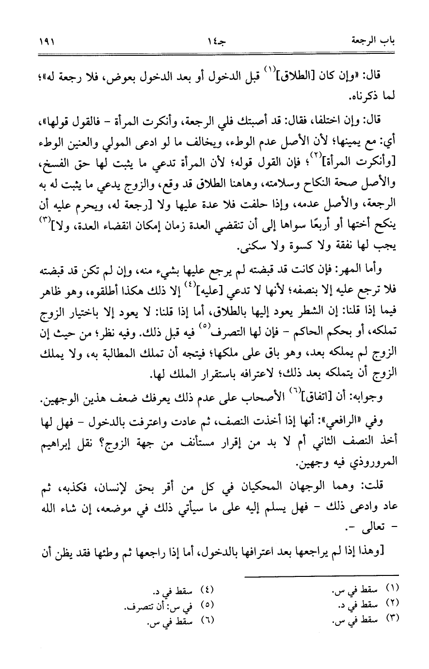 قال: وإن اختلفا، فقال: قد أصبتك فلي الرجعة، وأنكرت المرأة- فالقول قولها"، أي: مع يمينها؛ لأن الأصل عدم الوطء، ويخالف ما لو ادعى المولي والعنين الوطء [وأنكرت المرأة]؛ فإن القول قوله؛ لأن المرأة تدعي ما يثبت لها حق الفسخ، والأصل صحة النكاح وسلامته، وها هنا الطلاق قد وقع، والزوج يدعي ما يثبت له به الرجعة، والأصل عدمه، وإذا حلفت فلا عدة عليها ولا [رجعة له، ويحرم عليه أن ينكح أختها أو أربعاً سواها إلى أن تنقضي العدة زمان إمكان انقضاء العدة، ولا] يجب لها نفقة ولا كسوة ولا سكنى.