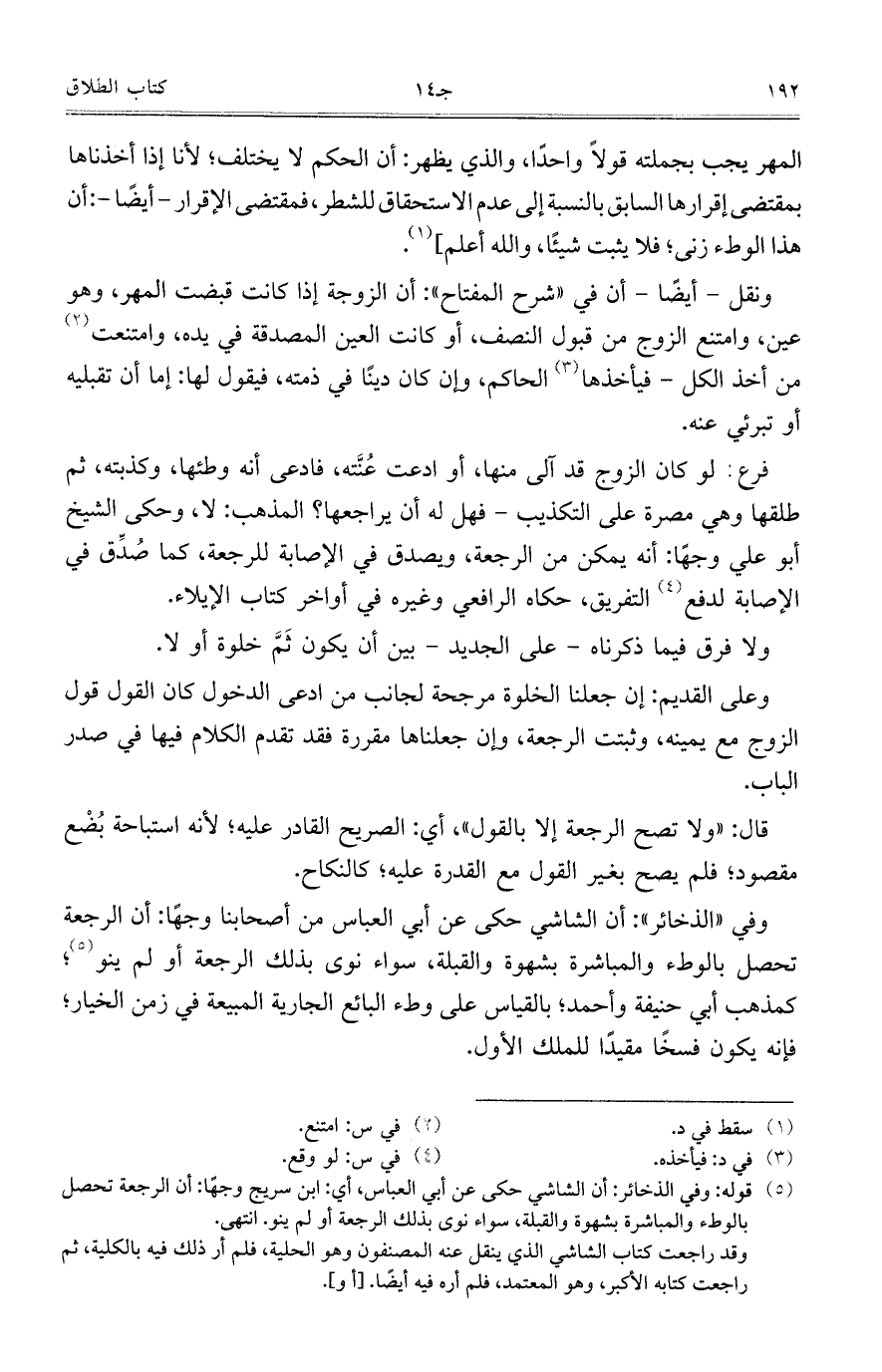 وفي "الذخائر": أن الشاشي حكى عن أبي العباس من أصحابنا وجهاً: أن الرجعة تحصل بالوطء والمباشرة بشهوة والقبلة، سواء نوى بذلك الرجعة أو لم ينو؛ كمذهب أبي حنيفة وأحمد؛ بالقياس على وطء البائع الجارية المبيعة في زمن الخيار؛ فإنه يكون فسخاً مقيداً للملك الأول.