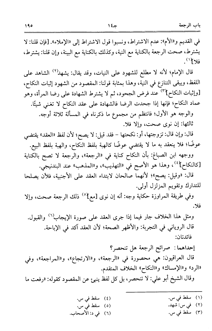 قال العراقيون: هي محصورة في "الرجعة"، و"الارتجاع"، و"المراجعة"، وفي "الرد" و"الإمساك" و"النكاح" الخلاف المتقدم.