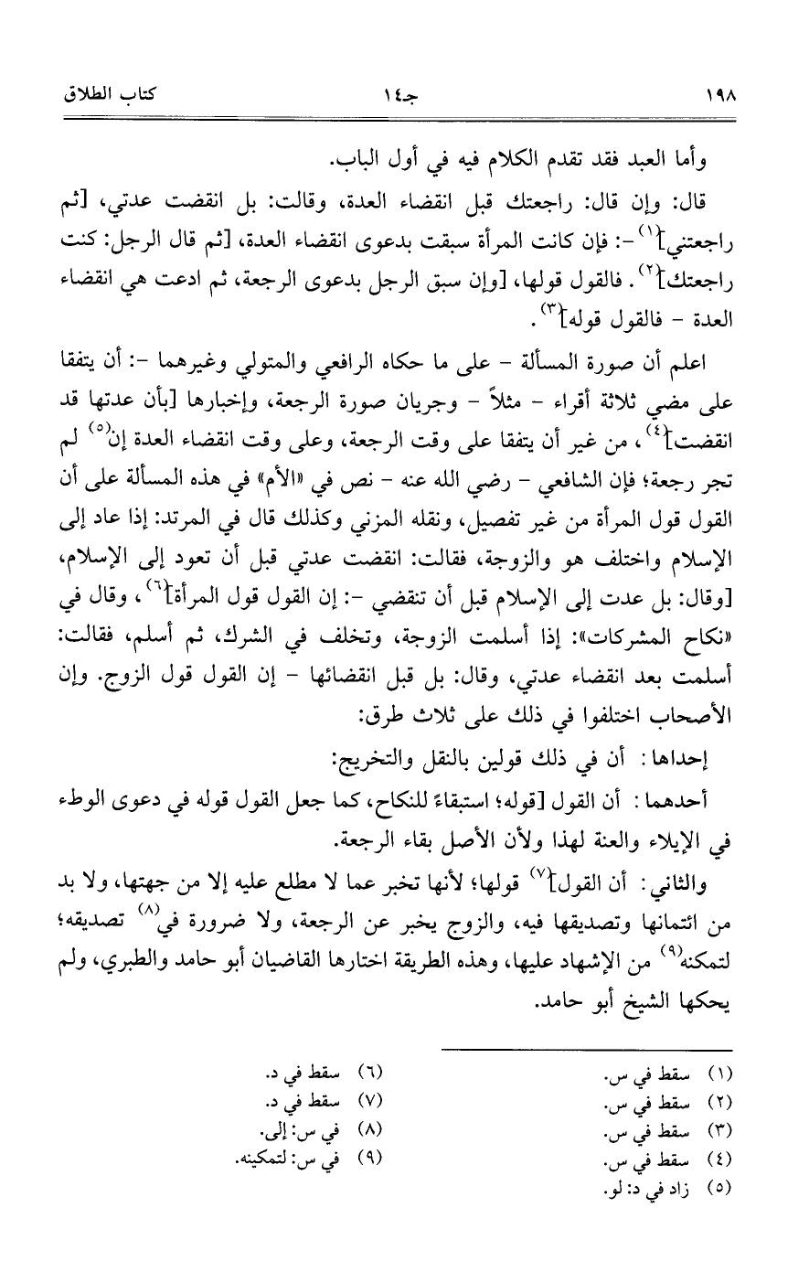 قال: وإن قال: راجعتك قبل انقضاء العدة، وقالت: بل انقضت عدتي، [ثم راجعتني]-: فإن كانت المرأة سبقت بدعوى انقضاء العدة، [ثم قال الرجل: كنت راجعتك]. فالقول قولها، [وإن سبق الرجل بدعوى الرجعة، ثم ادعت هي انقضاء العدة- فالقول قوله].