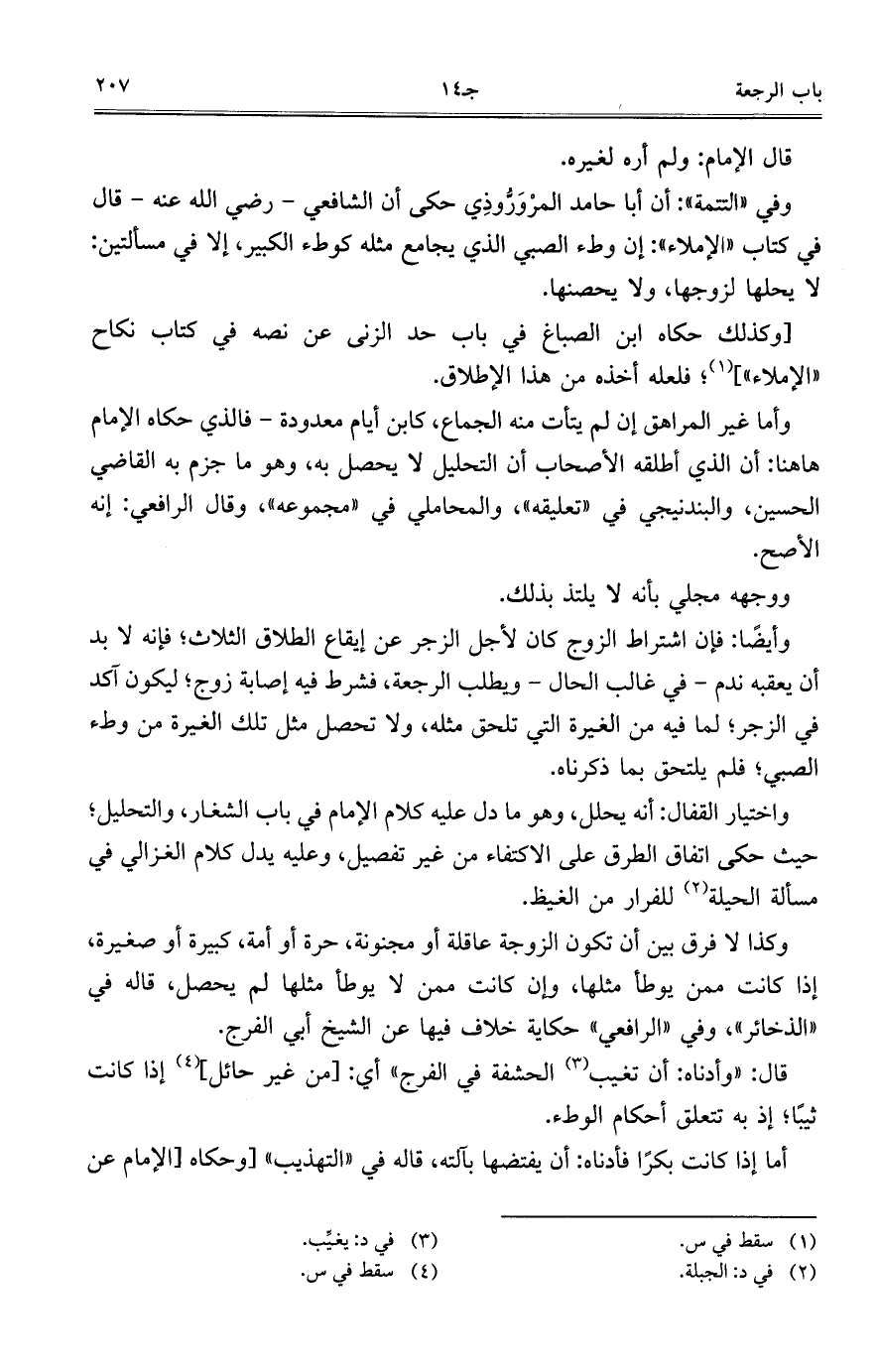 وكذا لا فرق بين أن تكون الزوجة عاقلة أو مجنونة، حرة أو أمة، كبيرة أو صغيرة، إذا كانت ممن يوطأ مثلها، وإن كانت ممن لا يوطأ مثلها لم يحصل، قاله في "الذخائر"، وفي "الرافعي" حكاية خلاف فيها عن الشيخ أبي الفرج.