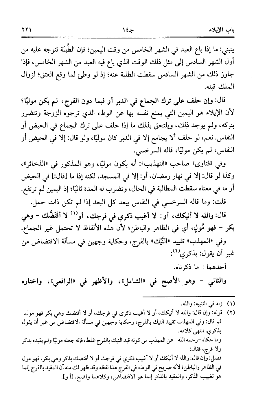 قال: والله لا أنيكك، أو: لا أغيب ذكري في فرجك، أو لا أفْتَضُّك- وهي بكر- فهو مُولٍ، أي في الظاهر والباطن؛ لأن هذه الألفاظ لا تحتمل غير الجماع.
