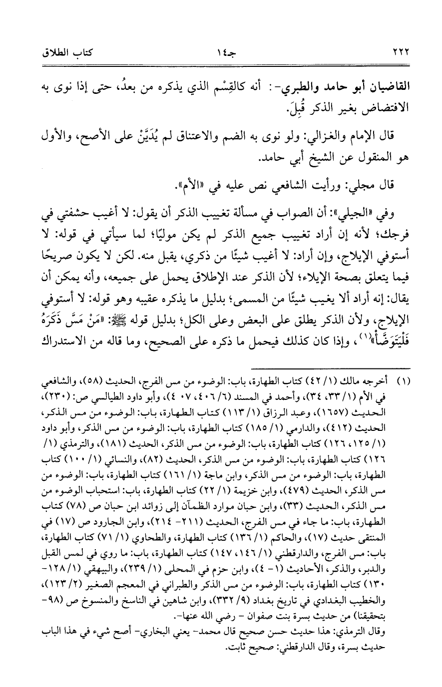 وفي "الجيلي": أن الصواب في مسألة تغييب الذكر أن يقول: لا أغيب حشفتي في فرجك؛ لأنه إن أراد تغييب جميع الذكر لم يكن مولياً؛ لما سيأتي في قوله: لا أستوفي الإيلاج، وإن أراد: لا أغيب شيئاً من ذكري، يقبل مه. لكن لا يكون صريحاً فيما يتعلق بصحة الإيلاء؛ لأن الذكر عند الإطلاق يحمل على جميعه، وأنه يمكن أن يقال: إنه أراد ألا يغيب شيئاً من المسمى؛ بدليل ما يذكره عقيبه وهو قوله: لا أستوفي الإيلاج، ولأن الذكر يطلق على البعض وعلى الكل؛ بدليل قوله صلى الله عليه وسلم: "مَنْ مَسَّ ذَكَرَهُ فَلْيَتَوَضَّا"، وإذا كان كذلك فيحمل ما ذكره على الصحيح، وما قاله من الاستدراك