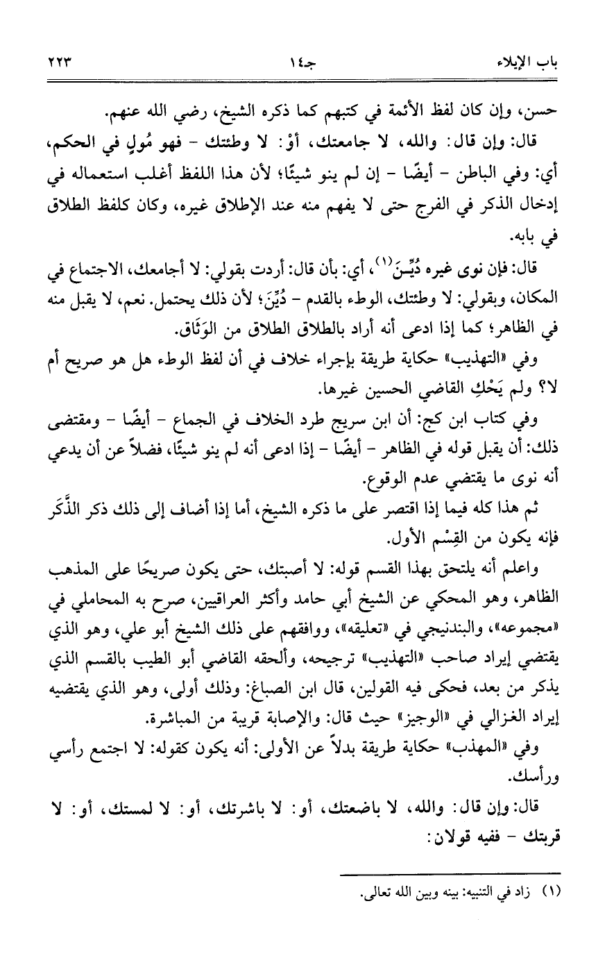 واعلم أنه يلتحق بهذا القسم قوله: لا أصبتك، حتى يكون صريحاً على المذهب الظاهر، وهو المحكي عن الشيخ أبي حامد وأكثر العراقيين، صرح به المحاملي في "مجموعه"، والبندنيجي في "تعليقه"، ووافقهم على ذلك الشيخ أبو علي، وهو الذي يقتضي إيراد صاحب "التهذيب" ترجيحه، وألحقه القاضي أبو الطيب بالقسم الذي يذكر من بعد، فحكى فيه القولين، قال ابن الصباغ: وذلك أولى، وهو الذي يقتضيه إيراد الغزالي في "الوجيز" حيث قال: والإصابة قريبة من المباشرة.
