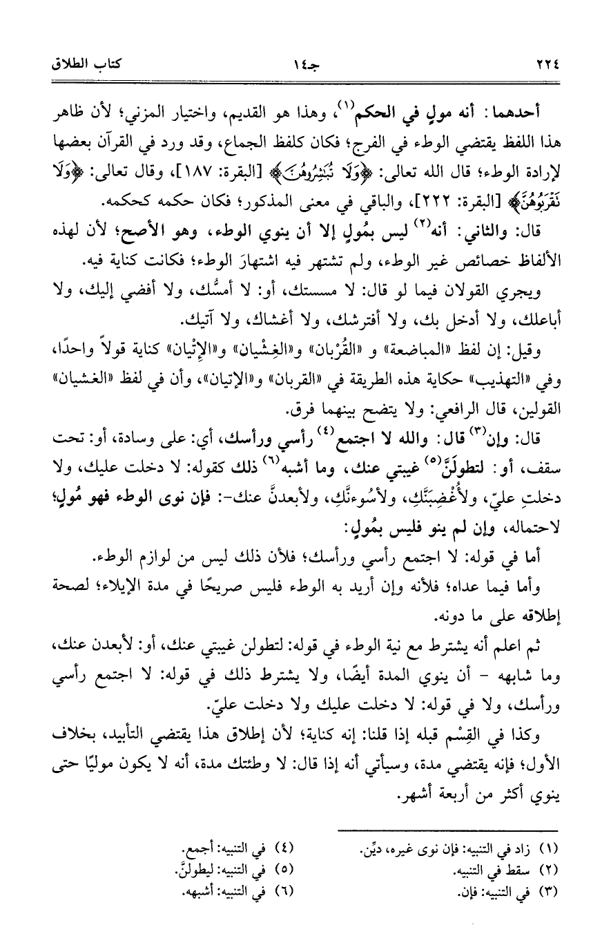 وقيلك إن لفظ "المباضعة" و"القُرْبان" و"الغِشْيان" و"الإِتْيان" كناية قولاً واحداً، وفي "التهذيب" حكاية هذه الطريقة في "القربان" و"الإتيان"، وأن في لفظ "الغشيان" القولين، قال الرافعي: ولا يتضح بينهما فرق.