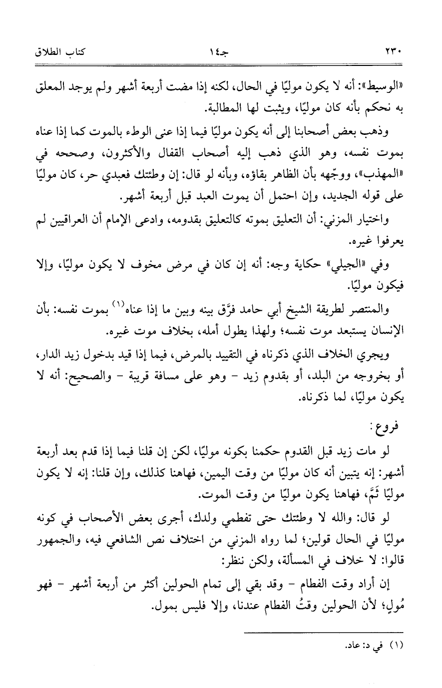"الوسيط": أنه لا يكون مولياً في الحال، لكنه إذا مضت أربعة اشهر ولم يوجد المعلق به نحكم بأنه كان مولياً، ويثبت لها المطالبة.