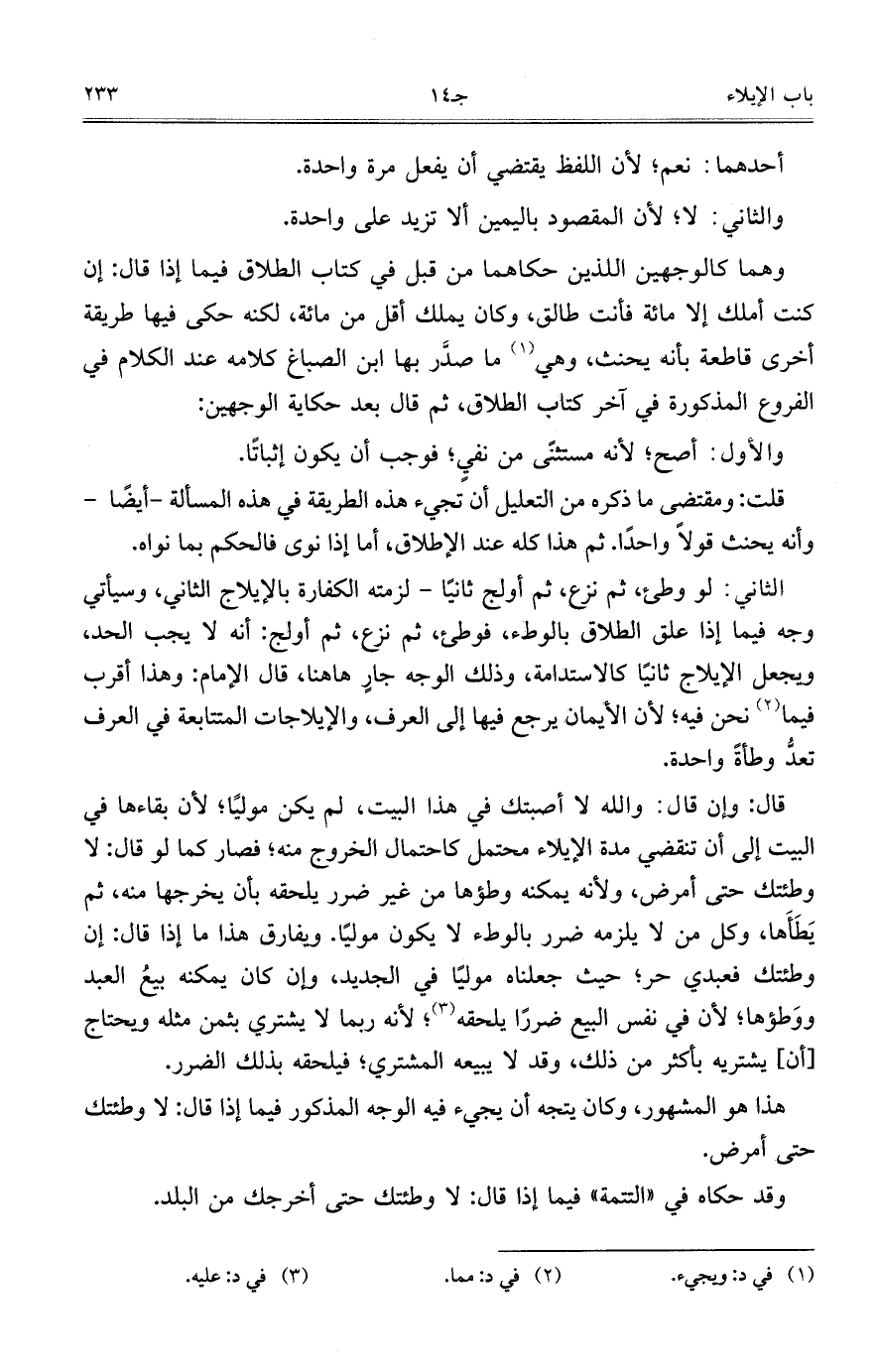 قال: وإن قال: والله لا أصبتك في هذا البيت، لم يكن مولياً؛ لأن بقاءها في البيت إلى أن تنقضي مدة الإيلاء محتمل كاحتمال الخروج منه؛ فصار كما لو قال: لا وطئتك حتى أمرض، ولأنه يمكنه وطؤها من غير ضرر يلحقه بأن يخرجها منه، ثم يَطَأَها، وكل من لا يلزمه ضرر بالوطء لا يكون مولياً. ويفارق هذا ما إذا قال: إن وطئتك فعبدي حر؛ حيث جعلناه مولياً في الجديد، وإن كان يمكنه بيعُ العبد ووَطؤها؛ لأن في نفس البيع ضرراً يلحقه؛ لأنه ربما لا يشتري بثمن مثله ويحتاج [أن] يشتريه بأكثر من ذلك، وقد لا يبيعه المشتري؛ فيلحقه بذلك الضرر.