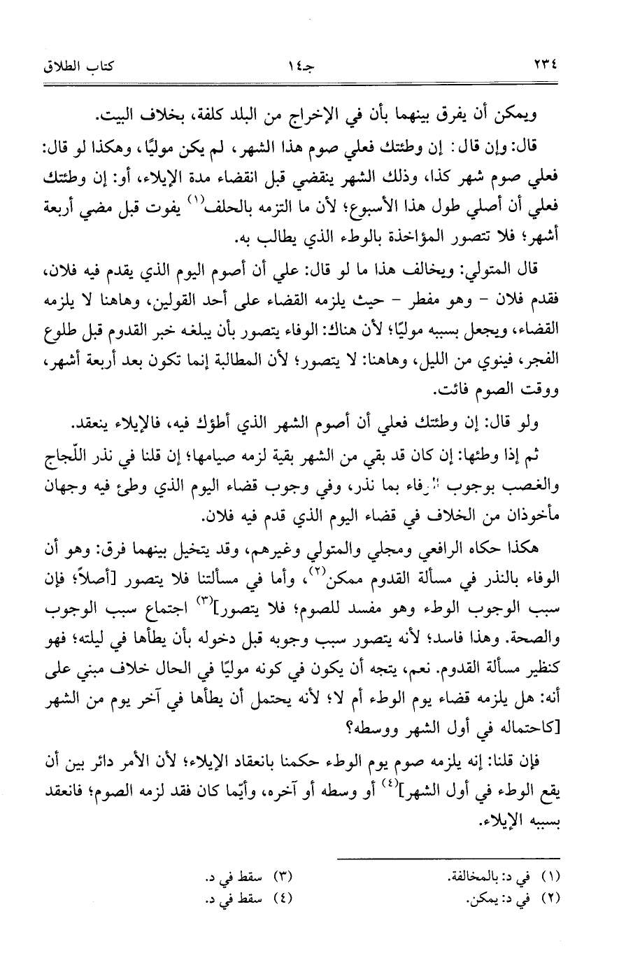هكذا حكاه الرافعي ومجلي والمتولي وغيرهم، وقد يتخيل بينهما فرق: وهو أن الوفاء بالنذر في مسألة القدوم ممكن، وأما في مسألتنا فلا يتصور [أصلاً؛ فإن سبب الوجوب الوطء وهو مفسد للصوم؛ فلا يتصور] اجتماع سبب الوجوب والصحة. وهذا فاسد؛ لأنه يتصور سبب وجوبه قبل دخوله بأن يطأها في ليلته؛ فهو كنظير مسألة القدوم. نعم، يتجه أن يكون في كونه مولياً في الحال خلاف مبني على أنه: هل يلزمه قضاء يوم الوطء أم لا؛ لأنه يحتمل أن يطأها في آخر يوم من الشهر [كاحتماله في أول الشهر ووسطه؟