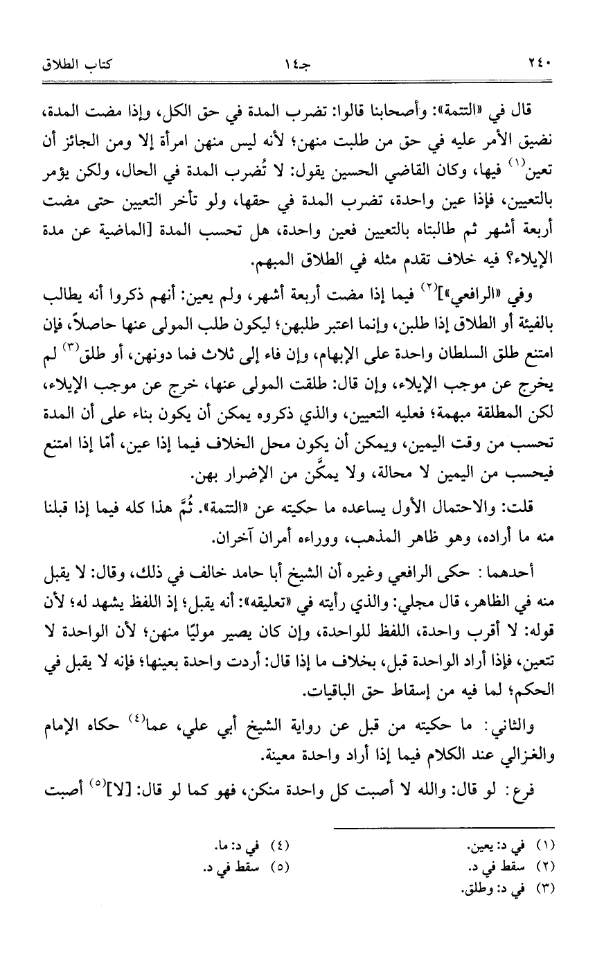 وفي "الرافعي"] فيما إذا مضت أربعة أشهر، ولم يعين: أنهم ذكروا أنه يطالب بالفيئة أو الطلاق إذا طلبن، وإنما اعتبر طلبهن؛ ليكون طلب المولى عنها حاصلاً، فإن امتنع طلق السلطان واحدة على الإبهام، وإن فاء إلى ثلاث فما دونهن، أو طلق لم يخرج عن موجب الإيلاء، وإن قال: طلقت المولى عنها، خرج عن موجب الإيلاء، لكن المطلقة مبهمة؛ فعليه التعيين، والذي ذكروه يمكن أن يكون بناءً على أن المدة تحسب من وقت اليمين، ويمكن أن يكون محل الخلاف فيما إذا عين، أمّا إذا امتنع فيحسب من اليمين لا محالة، ولا يمكَّن من الإضرار بهن.