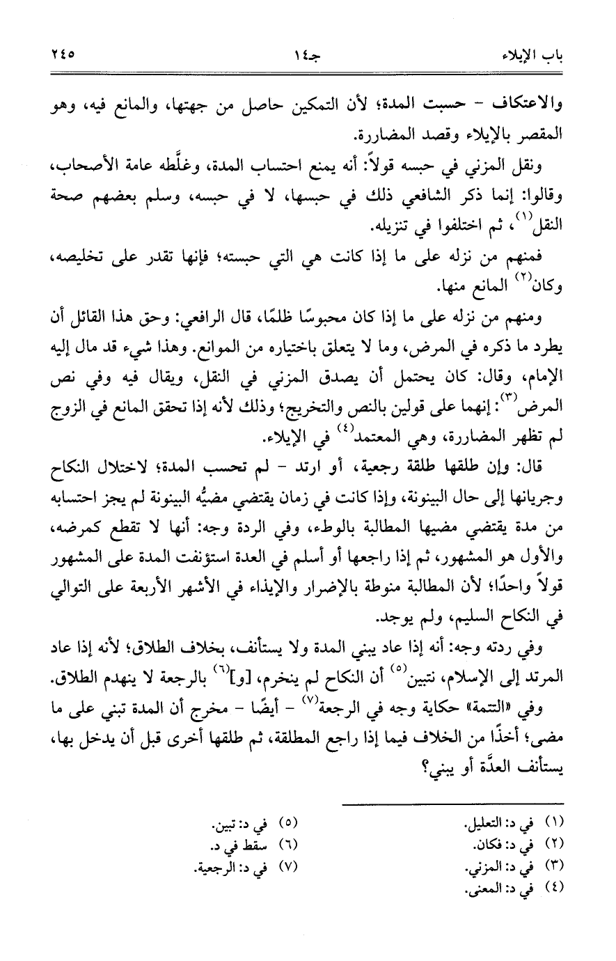 ونقل المزني في حبسه قولاً: أنه يمنع احتساب المدة، وغلَّطه عامة الأصحاب، وقالوا: إنما ذكر الشافعي ذلك في حبسها، لا في حبسه، وسلم بعضهم صحة النقل، ثم اختلفوا في تنزيله.