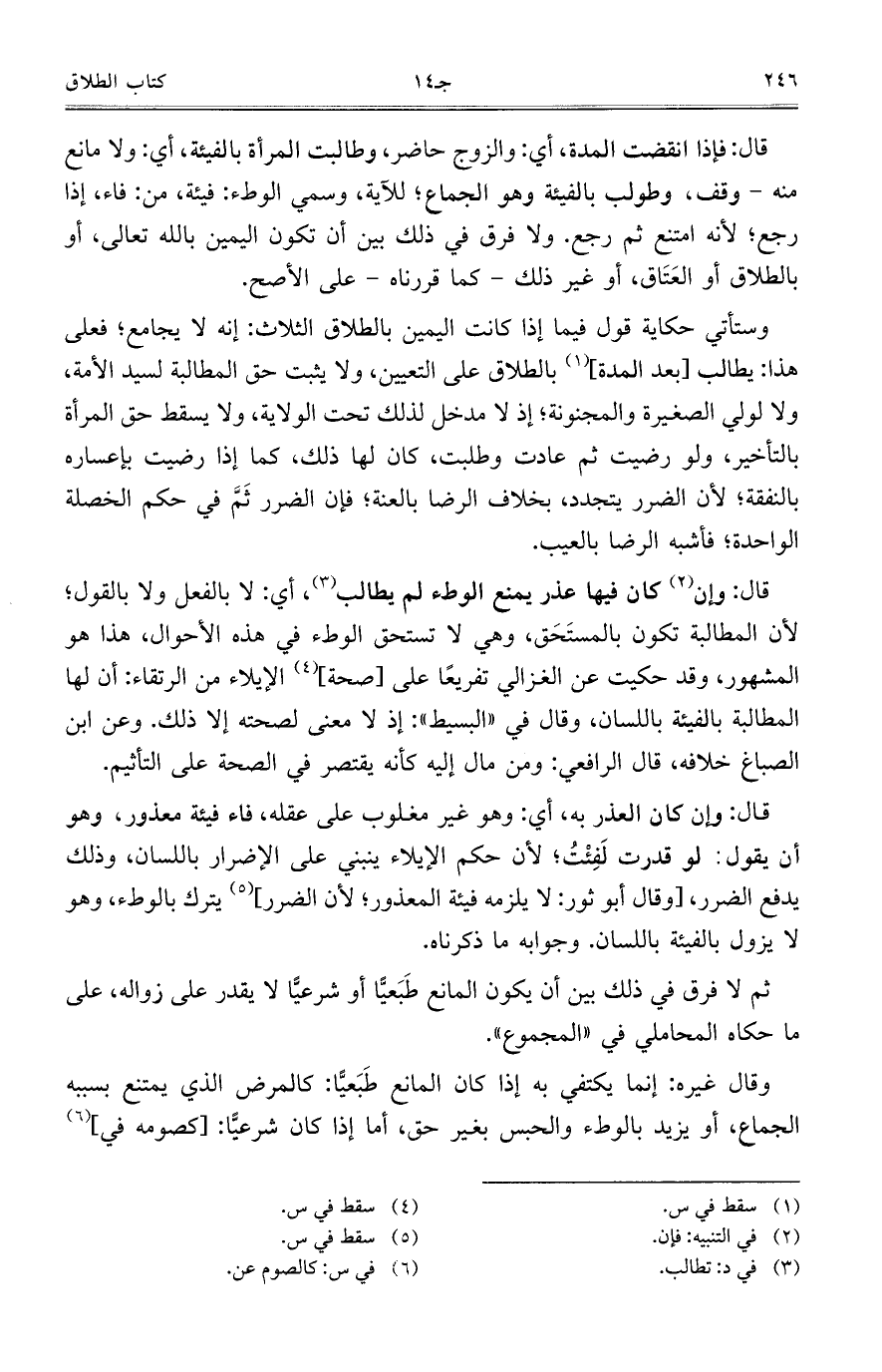 وقال غيره: إنما يكتفي به إذا كان المانع طَبَعيّاً: كالمرض الذي يمتنع بسببه الجماع، أو يزيد بالوطء والحبس بغير حق، أما إذا كان شرعيّاً: [كصومه في]