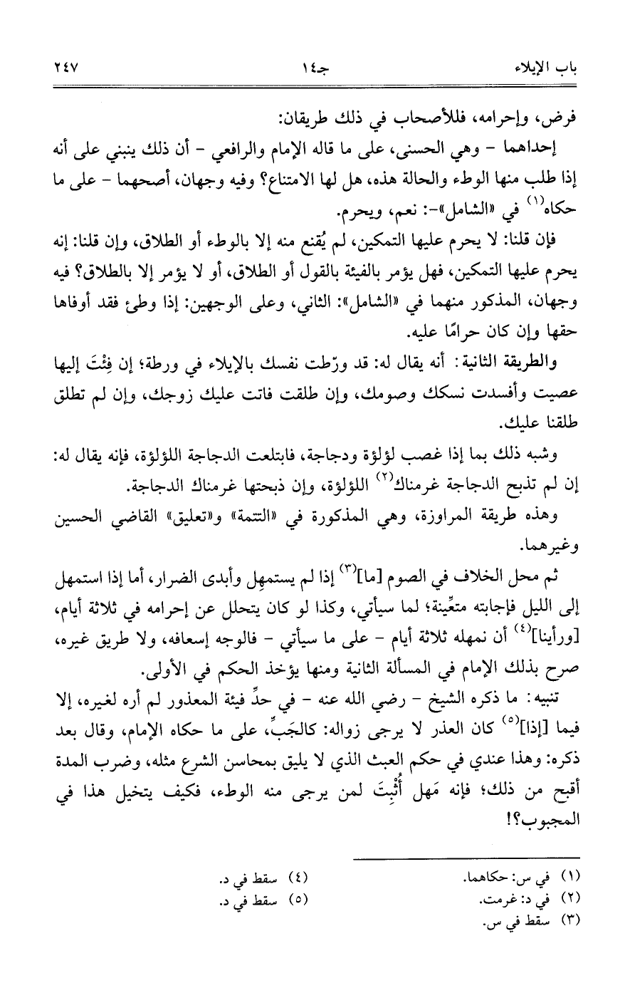 والطريقة الثانية: أنه يقال له: قد ورّطت نفسك بالإيلاء في ورطة؛ إن فِئْتَ إليها عصيت وأفسدت نسكك وصمك، وإن طلقت فاتت عليك زوجك، وإن لم تطلق طلقنا عليك.