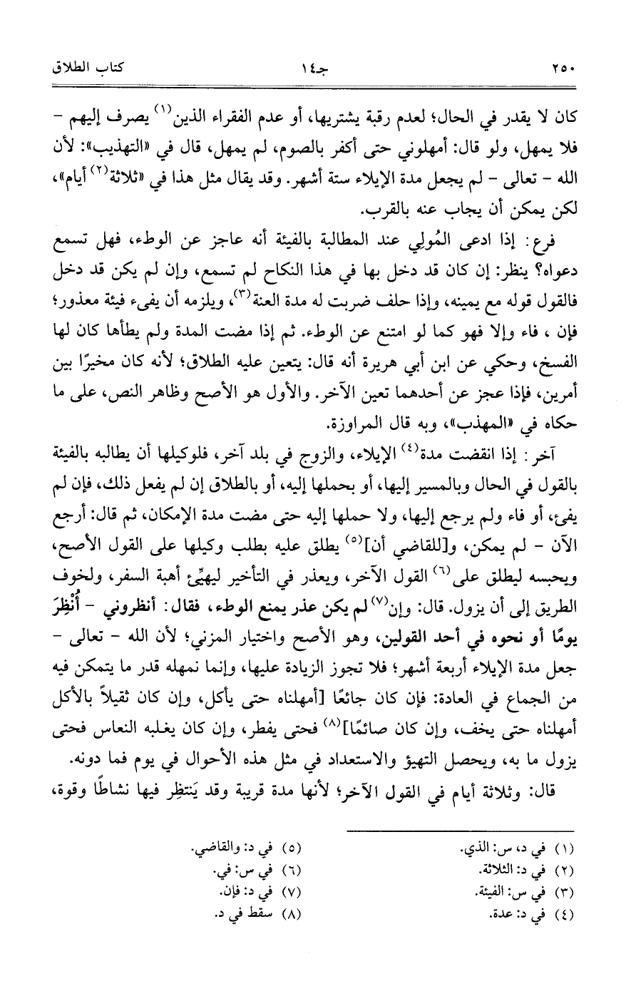 آخر: إذا انقضت مدة الإيلاء، والزوج في بلد آخر، فلوكيلها أن يطالبه بالفيئة بالقول في الحال وبالمسير إليها، أو بحملها إليه، أو بالطلاق إن لم يفعل ذلك، فإن لم يفيء، أو فاء ولم يرجع إليها، ولا حملها إليه حتى مضت مدة الإمكان، ثم قال: أرجع الآن- لم يمكن، و [للقاضي أن] يطلق عليه بطلب وكيلها على القول الأصح، ويحبسه ليطلق على القول الآخر، ويعذر في التأخير ليهيِّئ أهبة السفر، ولخوف الطريق إلى أن يزول. قال: وإن لم يكن عذر يمنع الوطء، فقال: أنظروني- أُنْظِرَ يوماً أو نحوه في أحد القولين، وهو الأصح واختيار المزني؛ لأن الله- تعالى- جعل مدة الإيلاء أربعة أشهر؛ فلا تجوز الزيادة عليها، وإنما نمهله قدر ما يتمكن فيه من الجماع في العادة: فإن كان جائعاً [أمهلناه حتى يأكل، وإن كان ثقيلاً بالأكل أمهلناه حتى يخف، وإن كان صائماً] فحتى يفطر، وإن كان يغلبه النعاس فحتى يزول ما به، ويحصل التهيؤ والاستعداد في مثل هذه الأحوال في يوم فما دونه.