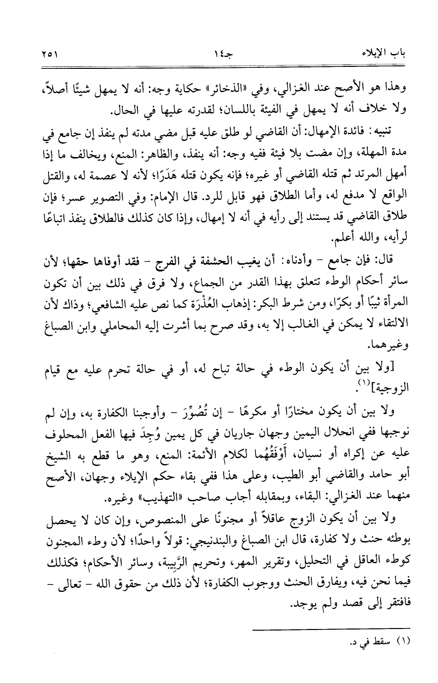 ولا بين أن يكون مختاراً أو مكرهاً- إن تُصُوِّرَ- وأوجبنا الكفارة به، وإن لم نوجبها ففي انحلال اليمين وجهان جاريان في كل يمين وُجِدَ فيها الفعل المحلوف عليه عن إكراه أو نسيان، أَوْفَقُهُما لكلام الأئمة: المنع، وهو ما قطع به الشيخ أو حامد والقاضي أبو الطيب، وعلى هذا ففي بقاء حكم الإيلاء وجهان، الأصح منهما عند الغزالي: البقاء، وبمقابله أجاب صاحب "التهذيب" وغيره.