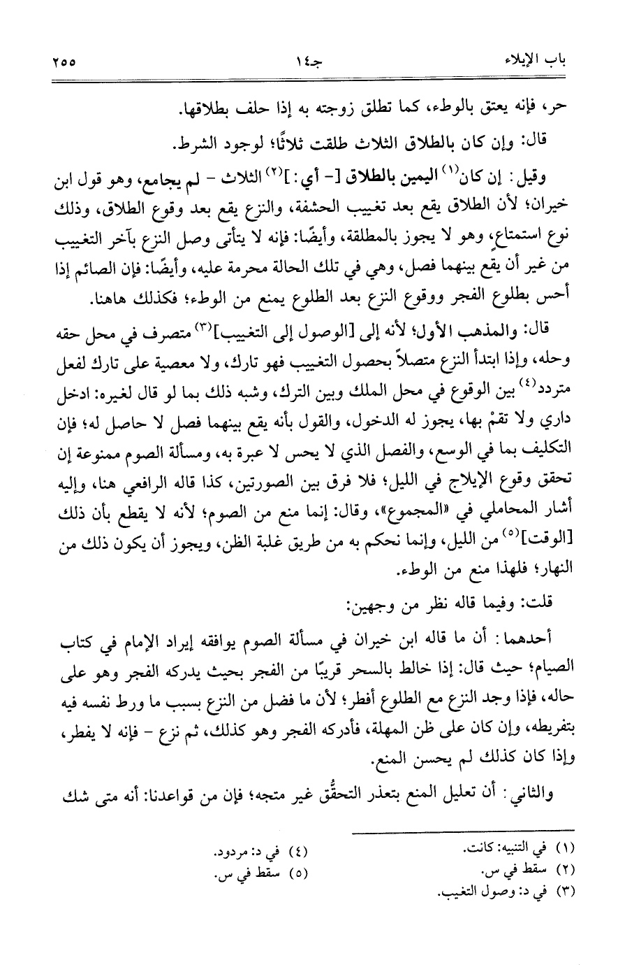 قال: والمذهب الأول؛ لأنه إلى [الوصول إلى التغييب] متصرف في محل حقه وحله، وإذا ابتدأ النزع متصلاً بحصول التغييب فهو تارك، ولا معصية على تارك لفعل متردد بين الوقوع في محل الملك وبين الترك، وشبه ذلك بما لو قال لغيره: ادخل داري ولا تقمْ بها، يجوز له الدخول، والقول بأنه يقع بينهما فصل لا حاصل له؛ فإن التكليف بما في الوسع، والفصل الذي لا يحس لا عبرة به، ومسألة الصوم ممنوعة إن تحقق وقوع الإيلاج في الليل؛ فلا فرق بين الصورتين، كذا قاله الرافعي هنا، وإليه أشار المحاملي في "المجموع"، وقال: إنما منع من الصوم؛ لأنه لا يقطع بأن ذلك [الوقت] من الليل، وإنما نحكم به من طريق غلبة الظن، ويجوز أن يكون ذلك من النهار؛ فلهذا منع من الوطء.