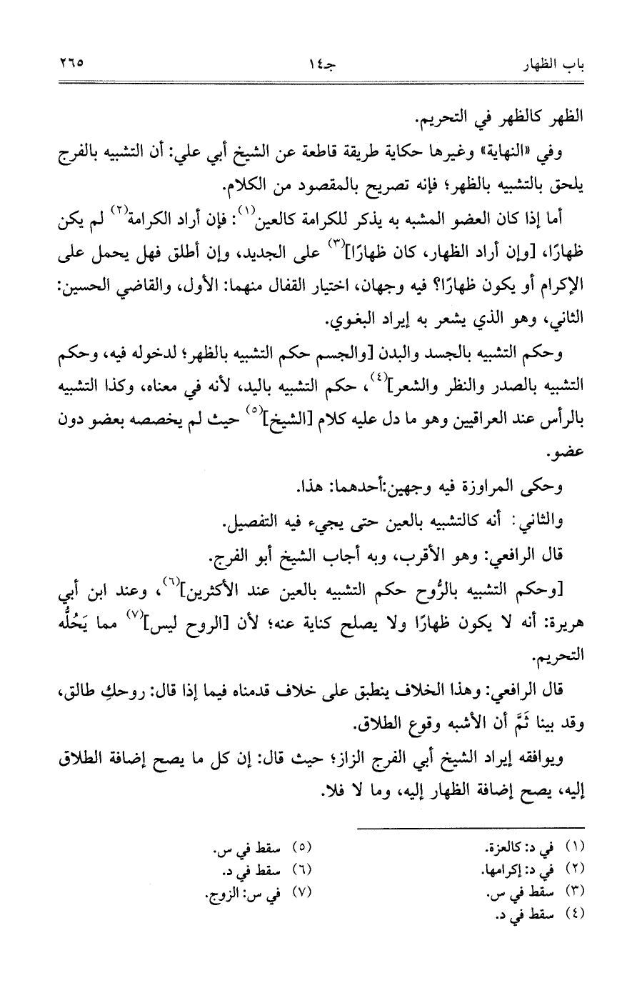 وفي "النهاية" وغيرها حكاية طريقة قاطعة عن الشيخ أبي علي: أن التشبيه بالفرج يلحق بالتشبيه بالظهر؛ فإنه تصريح بالمقصود من الكلام.